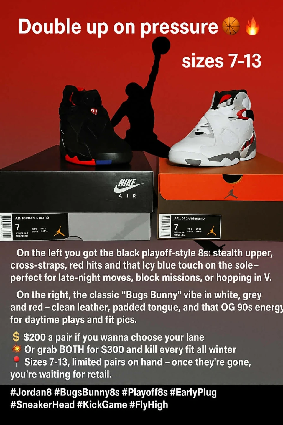 Selling a pair of Nike Air Jordan 8 Retro sneakers. One pair is black with red and blue accents, and the other is white, grey, and red, reminiscent of the classic "Bugs Bunny" vibe. Available in size 10-13