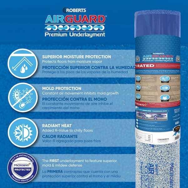 ROBERTS AirGuard Premium Underlayment is ideal for use under laminate and engineered wood flooring. It features an innovative AirFlow Technology that releases trapped moisture as a vapor to prevent damage to floors and subfloors. Its 3-layer design protects laminate and engineered hardwood flooring: The top layer is made of an impermeable film that keeps moisture away from flooring; the middle layer consists of thousands of cushioning, stabilizing polyshims that support the finished flooring; and the bottom layer is a permeable film that wicks moisture up from concrete or wood subfloors. Feel free to message if you have any questions!