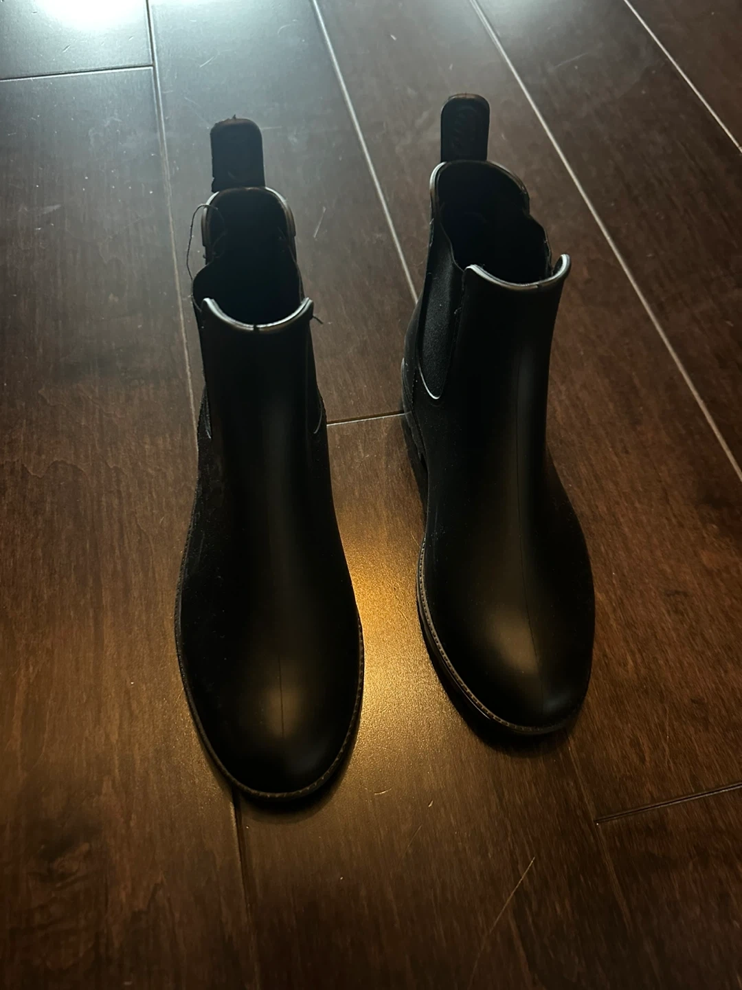 These black Chelsea rain boots are made of waterproof material. They feature elastic side panels for easy on and off. Perfect for wet weather! They're a size 6.5.