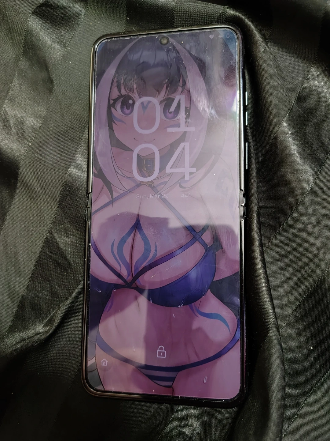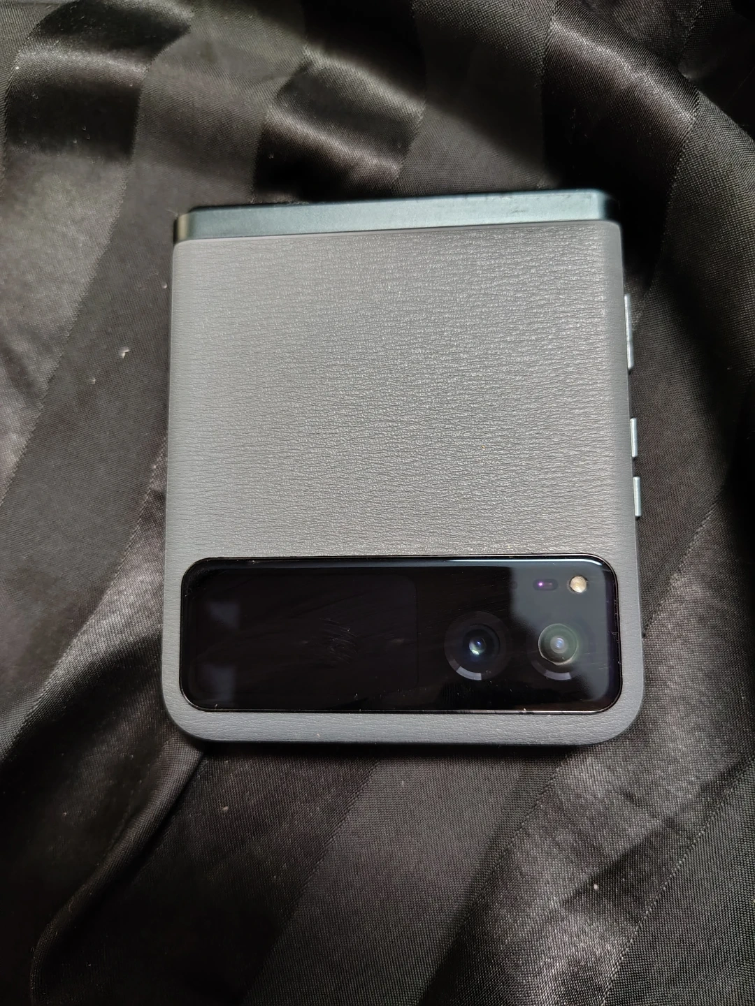 Comes with cover, This is a Motorola Razr flip phone in a gray color. It's a unique foldable design. The phone's screen displays the time and a wallpaper. It's for Boost Mobile clients or for anyone looking to go to boost mobile.