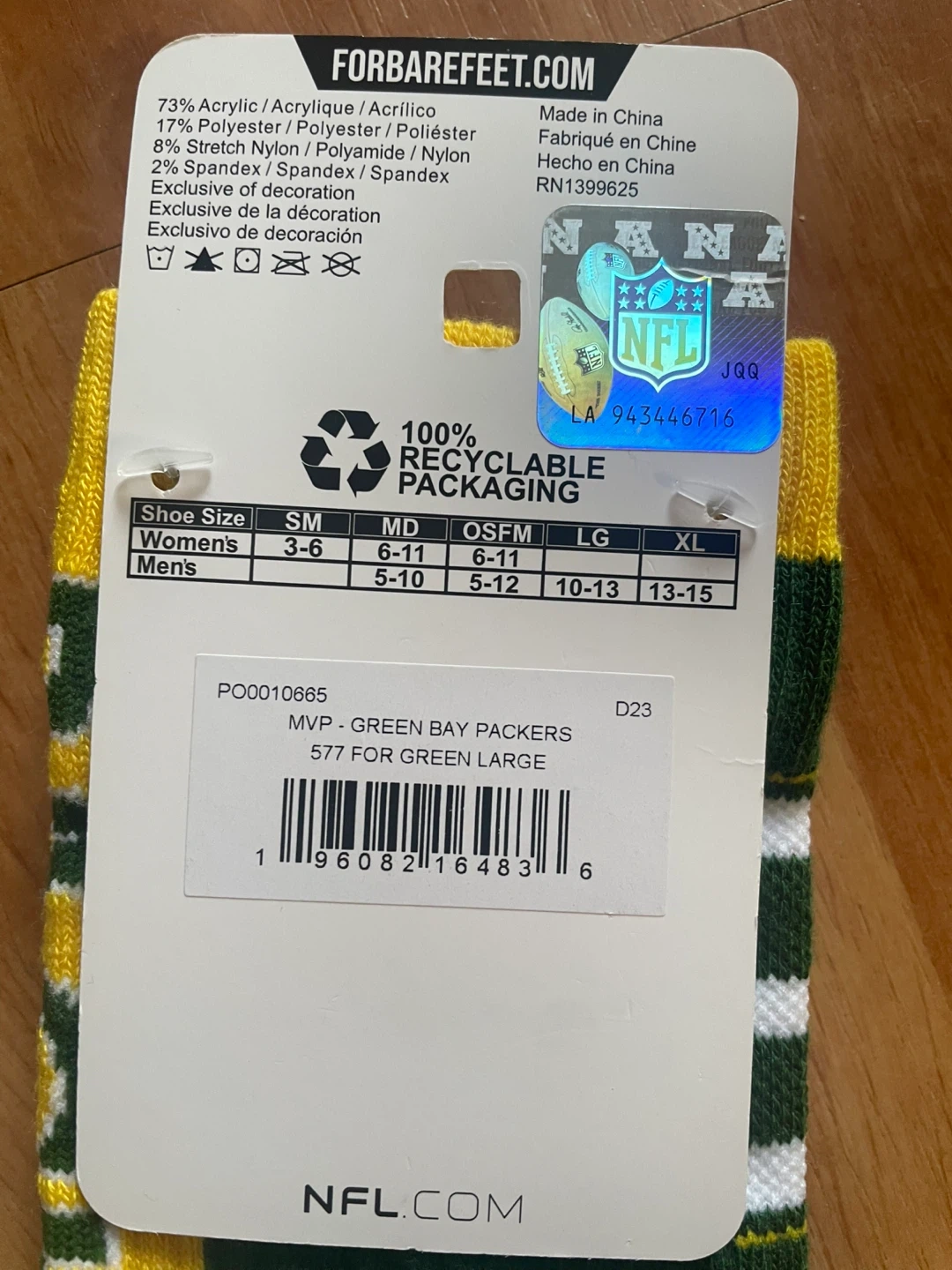 Green Bay Packers crew socks. 73% Acrylic, 17% Polyester, 8% Stretch Nylon, 2% Spandex. Size Large fits shoe sizes 10-13 for men.