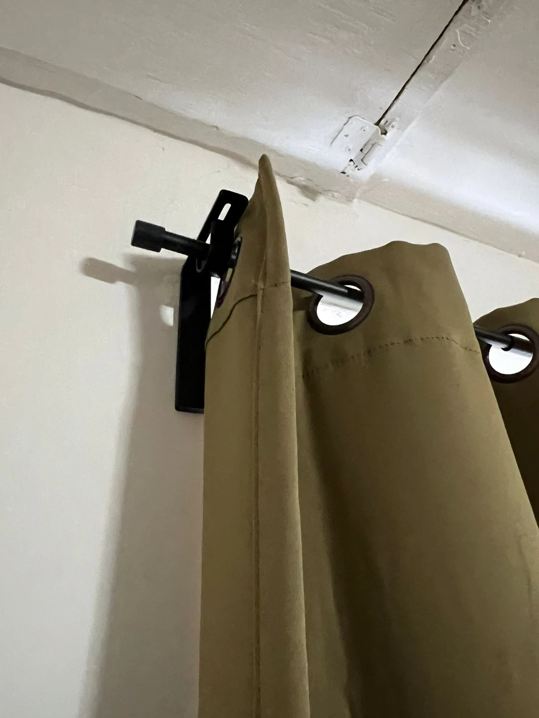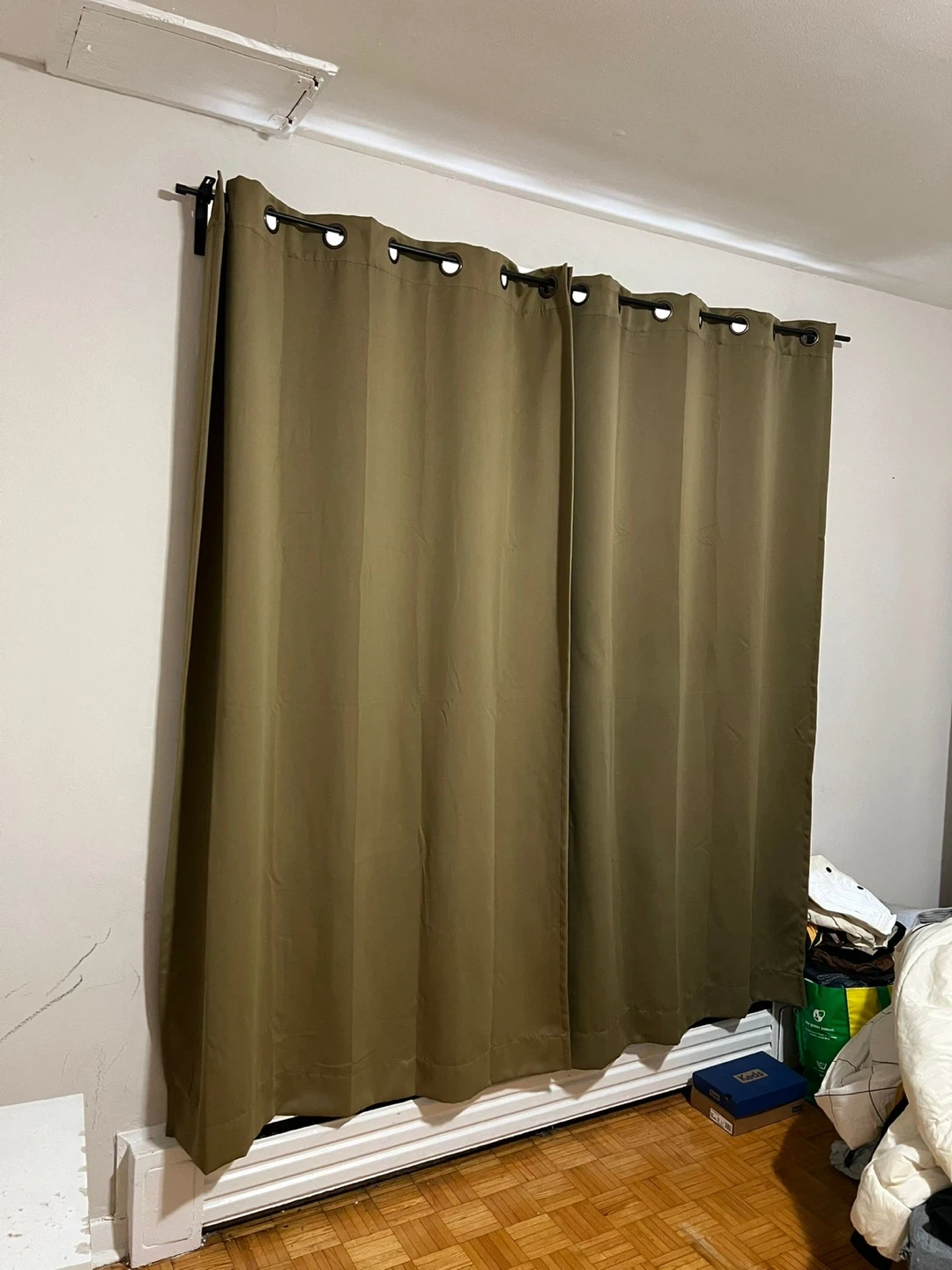 These curtains are a nice olive green colour. They're made with grommets for easy hanging. Great for adding privacy and blocking light in any room!