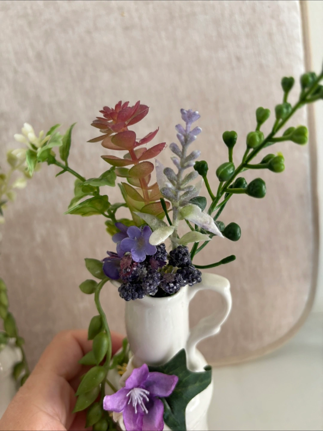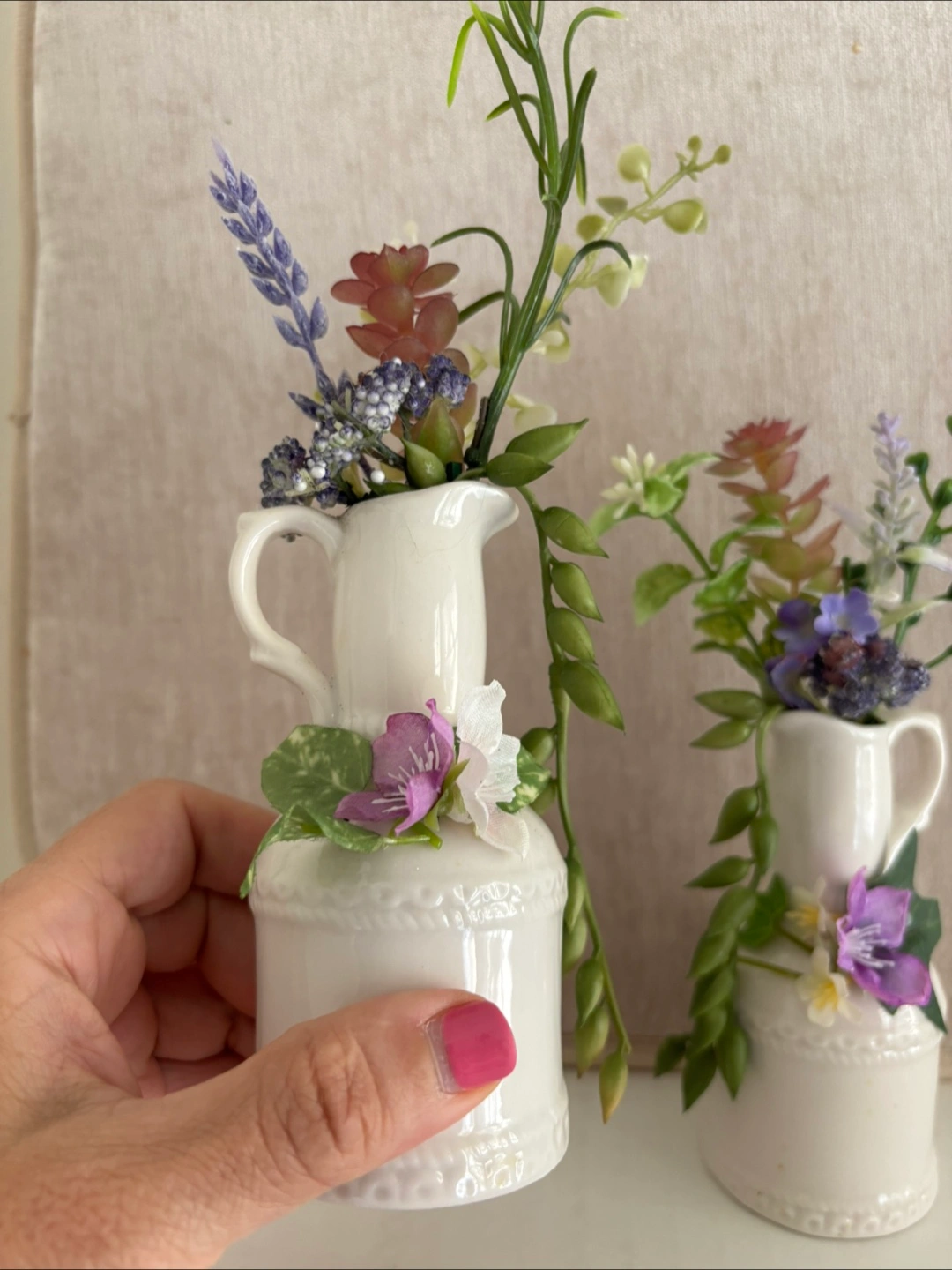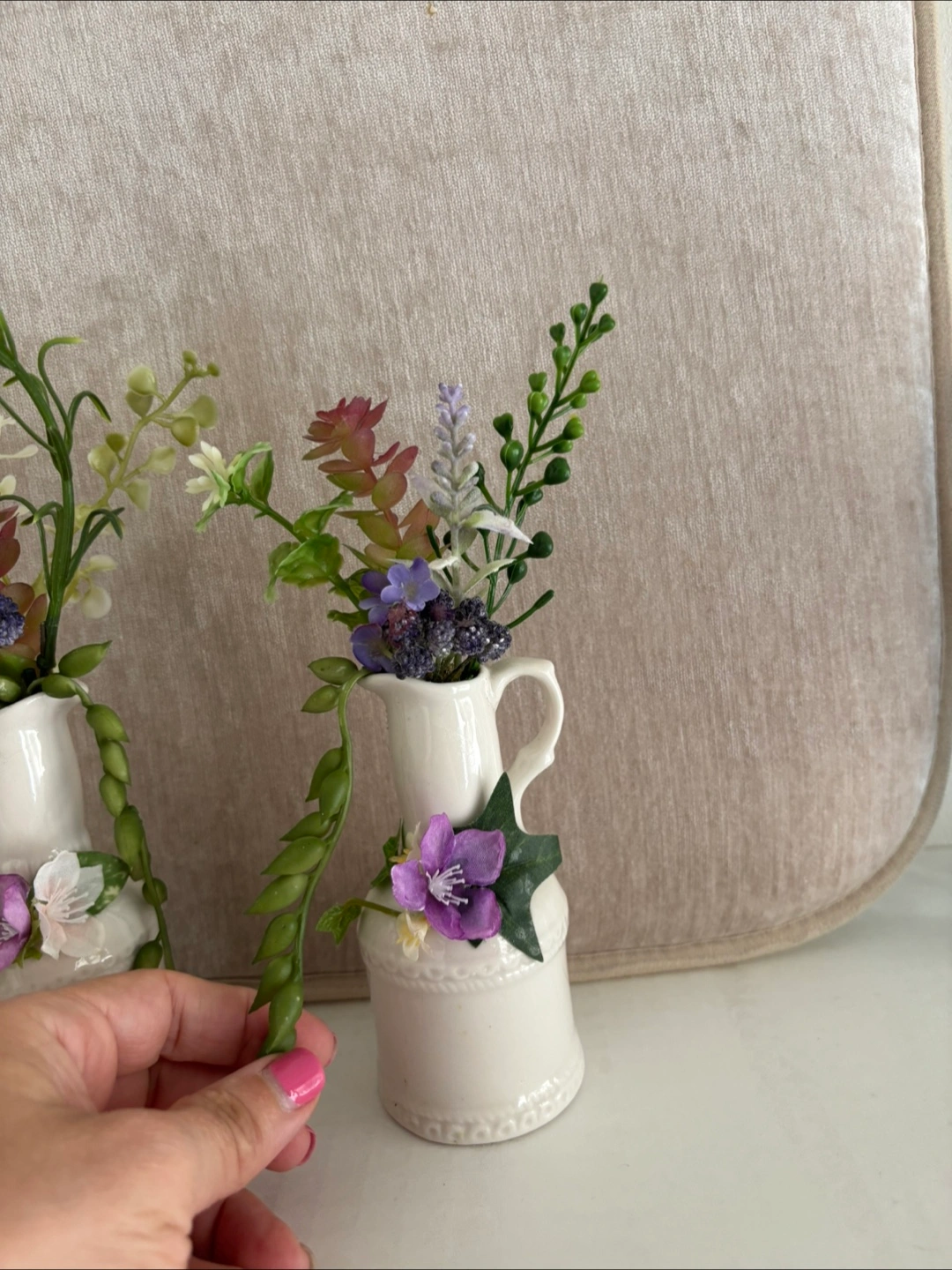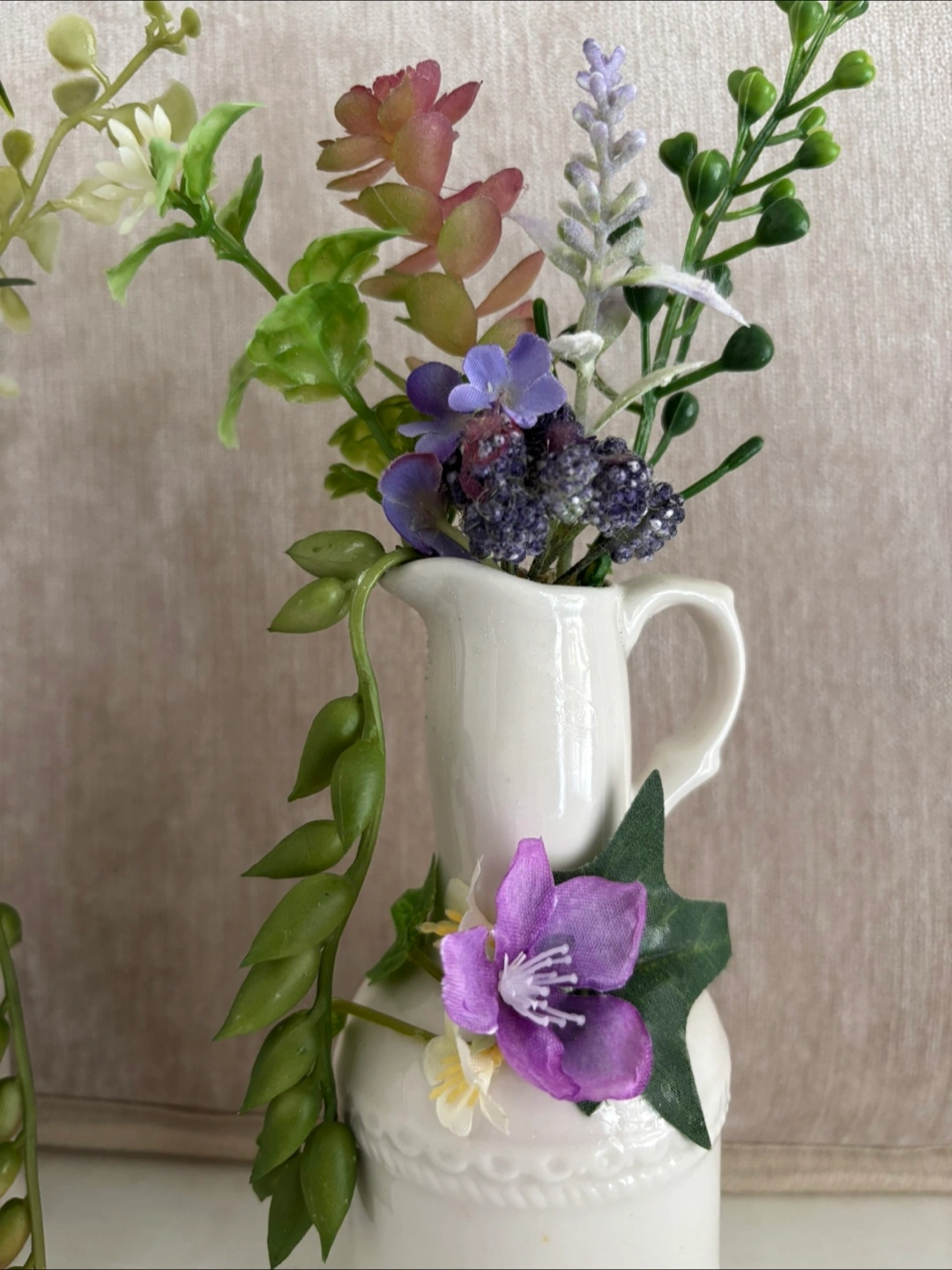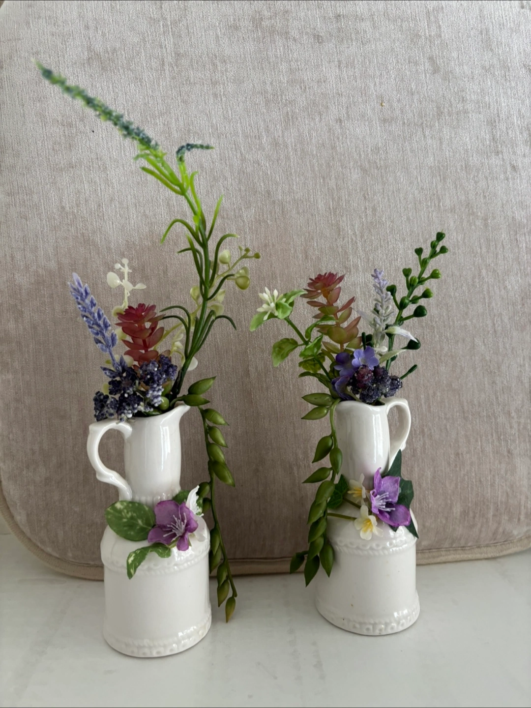 These adorable little white pitcher vases are decorated with artificial flowers and greenery! They'd be perfect for adding a touch of charm to any room or gift