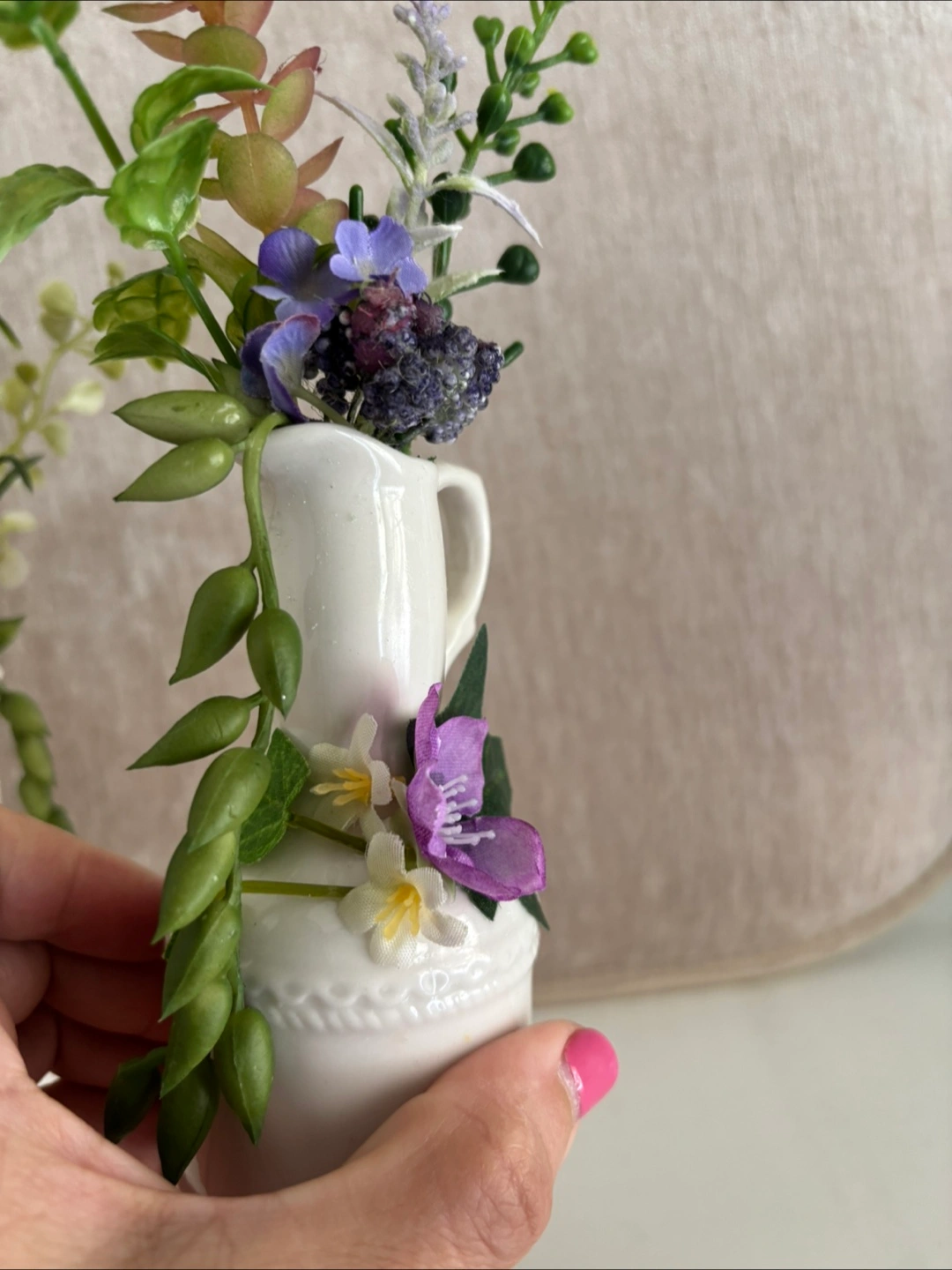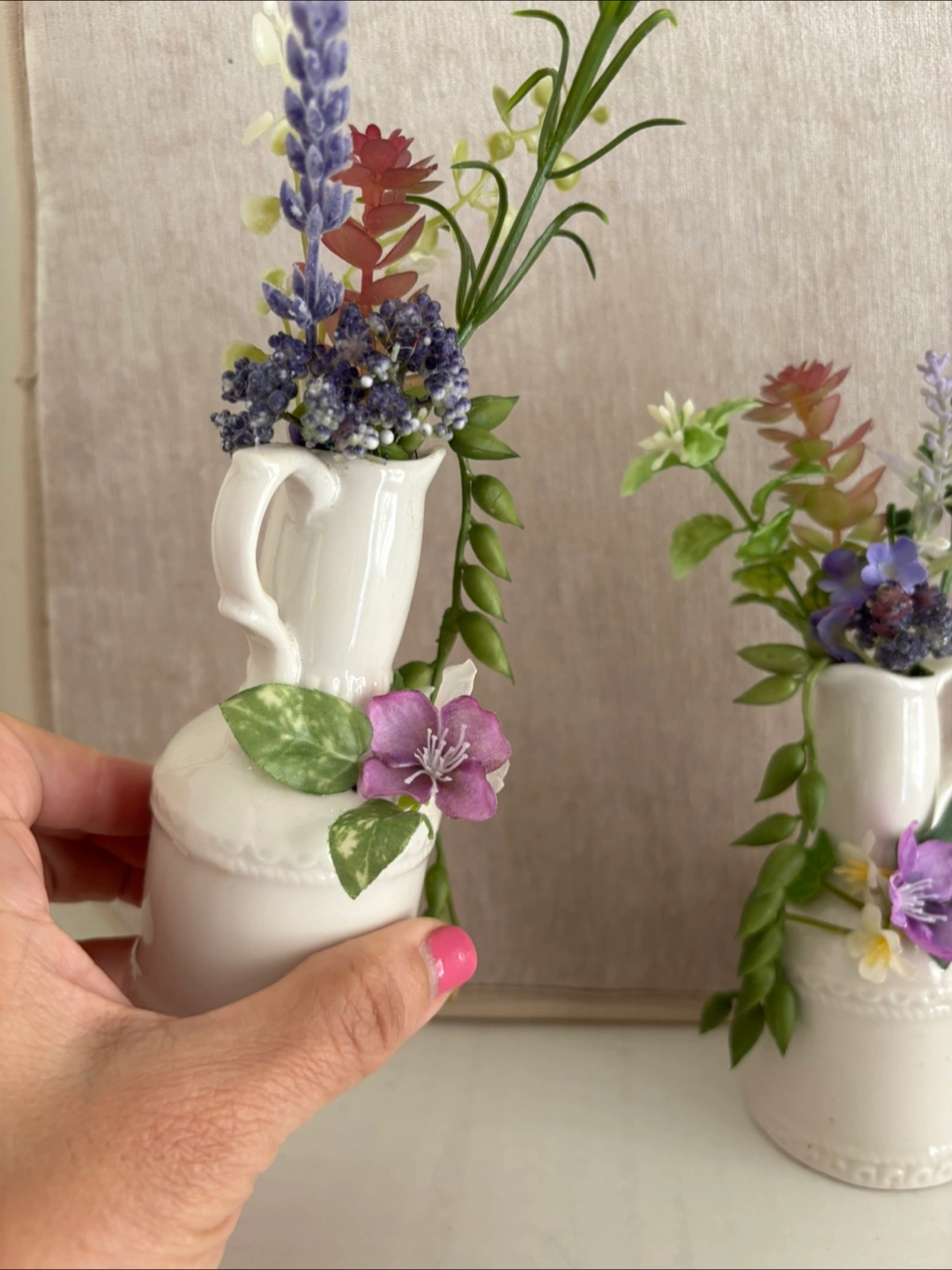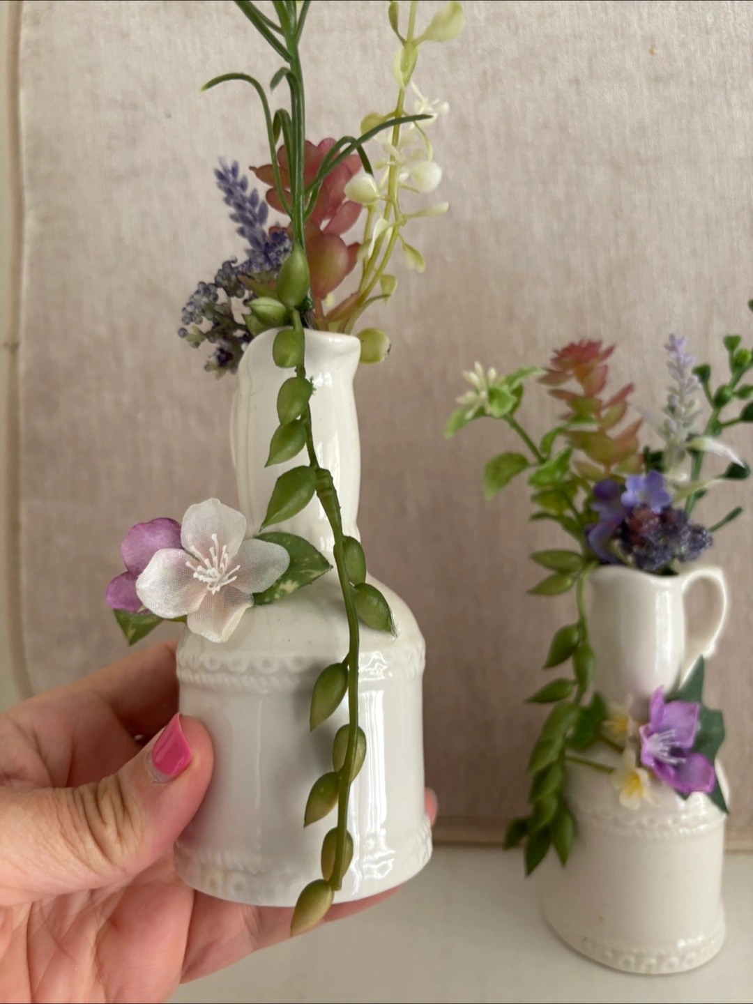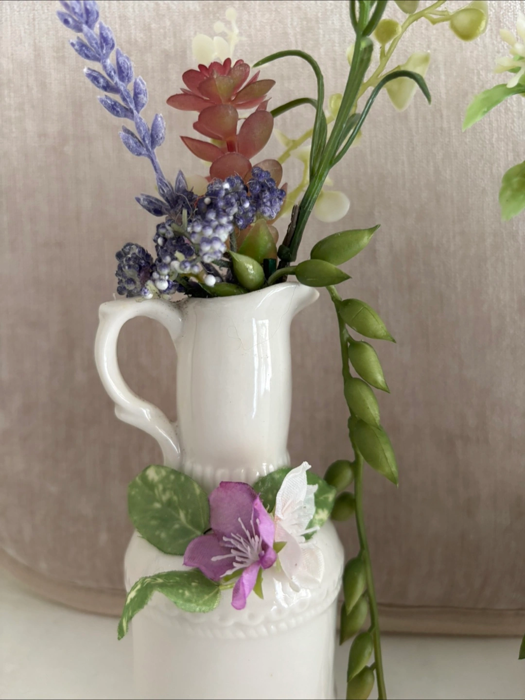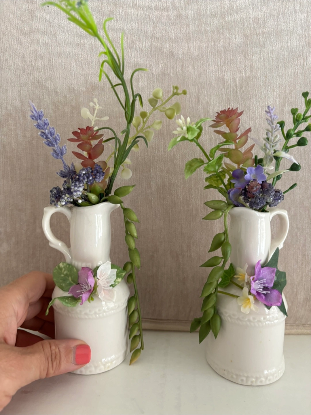 These adorable little white pitcher vases are decorated with artificial flowers and greenery! They'd be perfect for adding a touch of charm to any room or gift