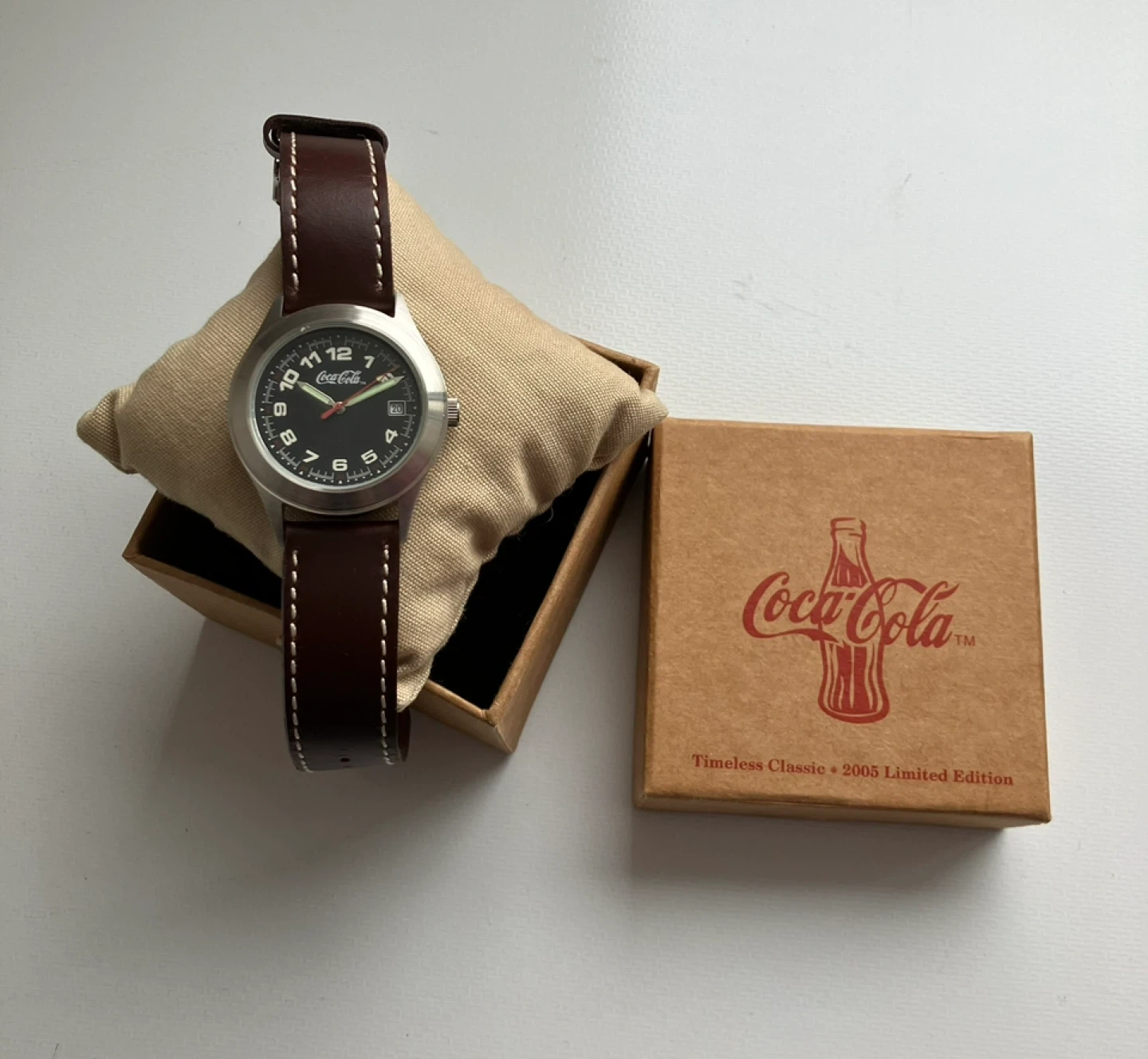 Coca-Cola 2005 Limited edition automatic, mechanical watch . Exhibition back. Watch comes with original box. Brown leather band. Mechanical watch with automatic movement.