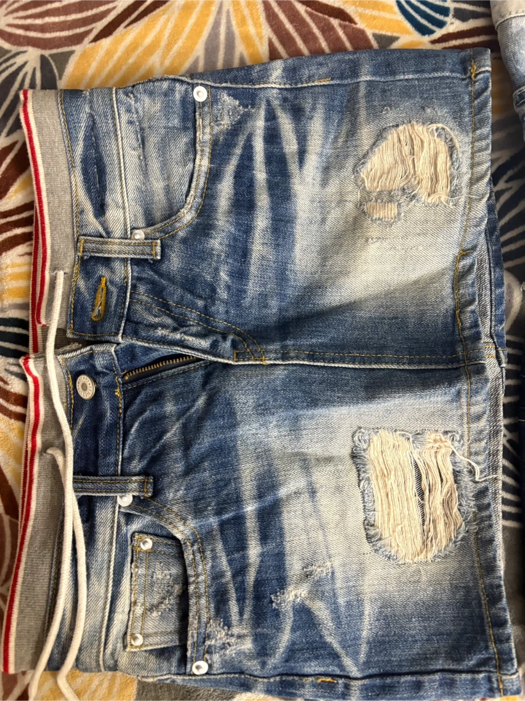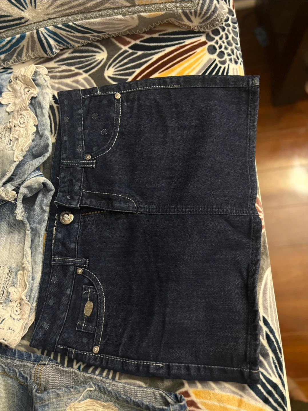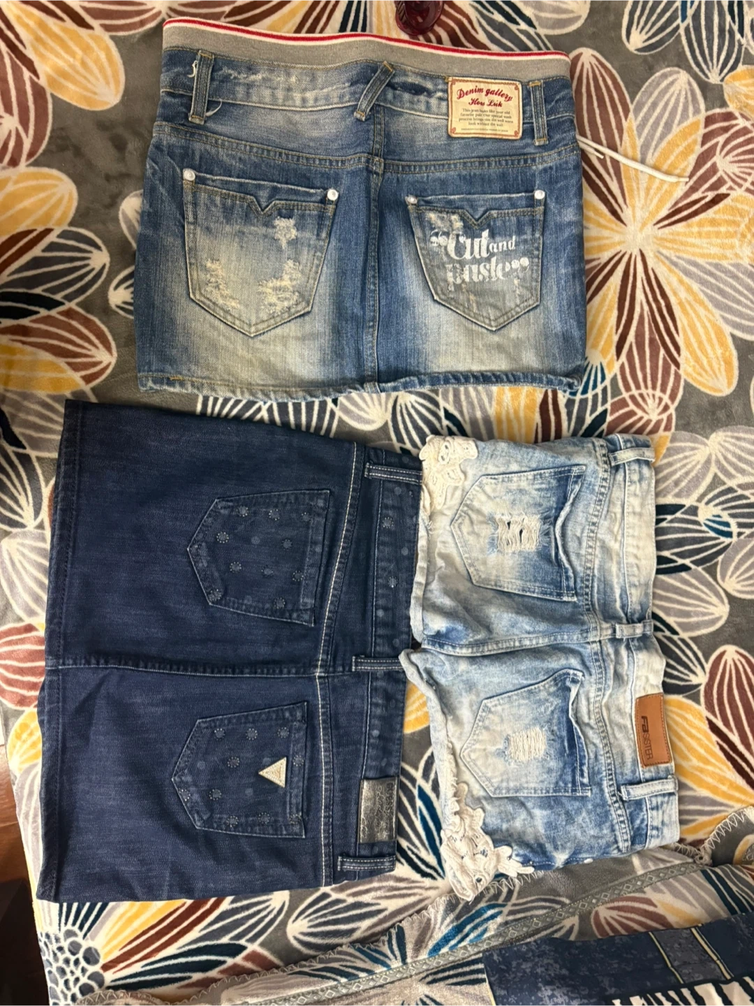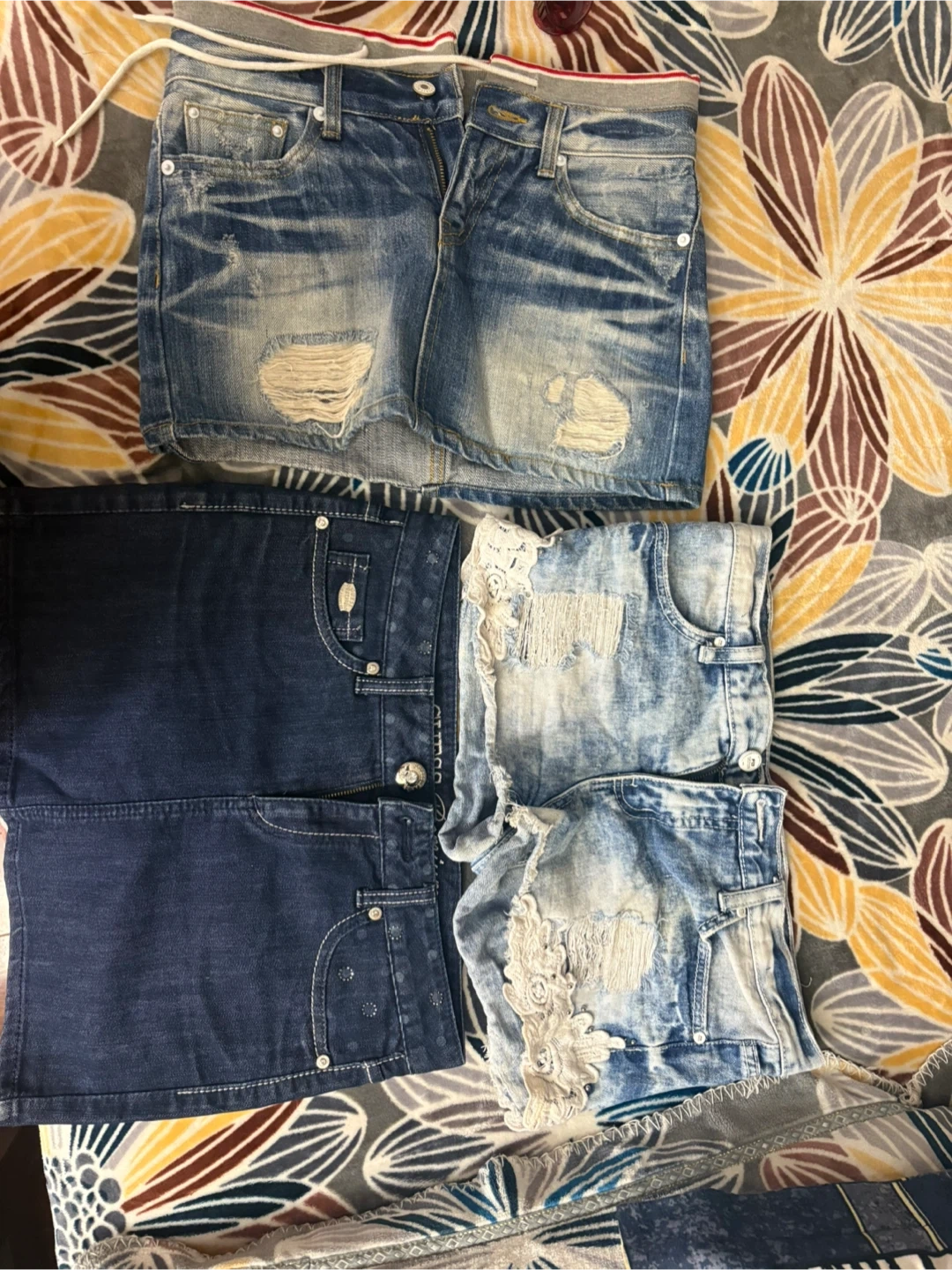 Bundle of 3 denim bottoms. Includes a Guess 2 denim skirts with distressed details and a light wash denim shorts with lace trim and distressing. Great for casual wear!