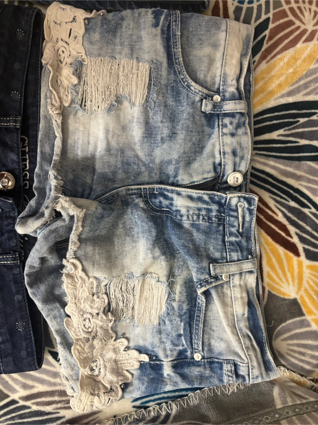 Bundle of 3 denim bottoms. Includes a Guess 2 denim skirts with distressed details and a light wash denim shorts with lace trim and distressing. Great for casual wear!