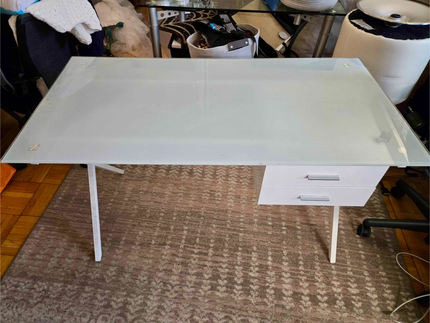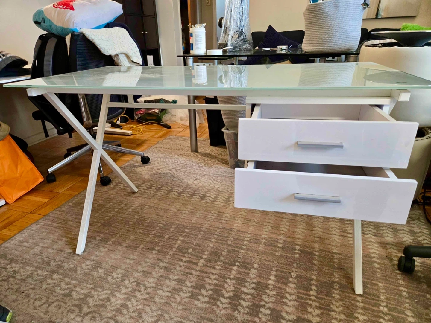 Frosted glass desk on a metal base with two wood laminate drawers. The glass top can be removed for easier transportation.
