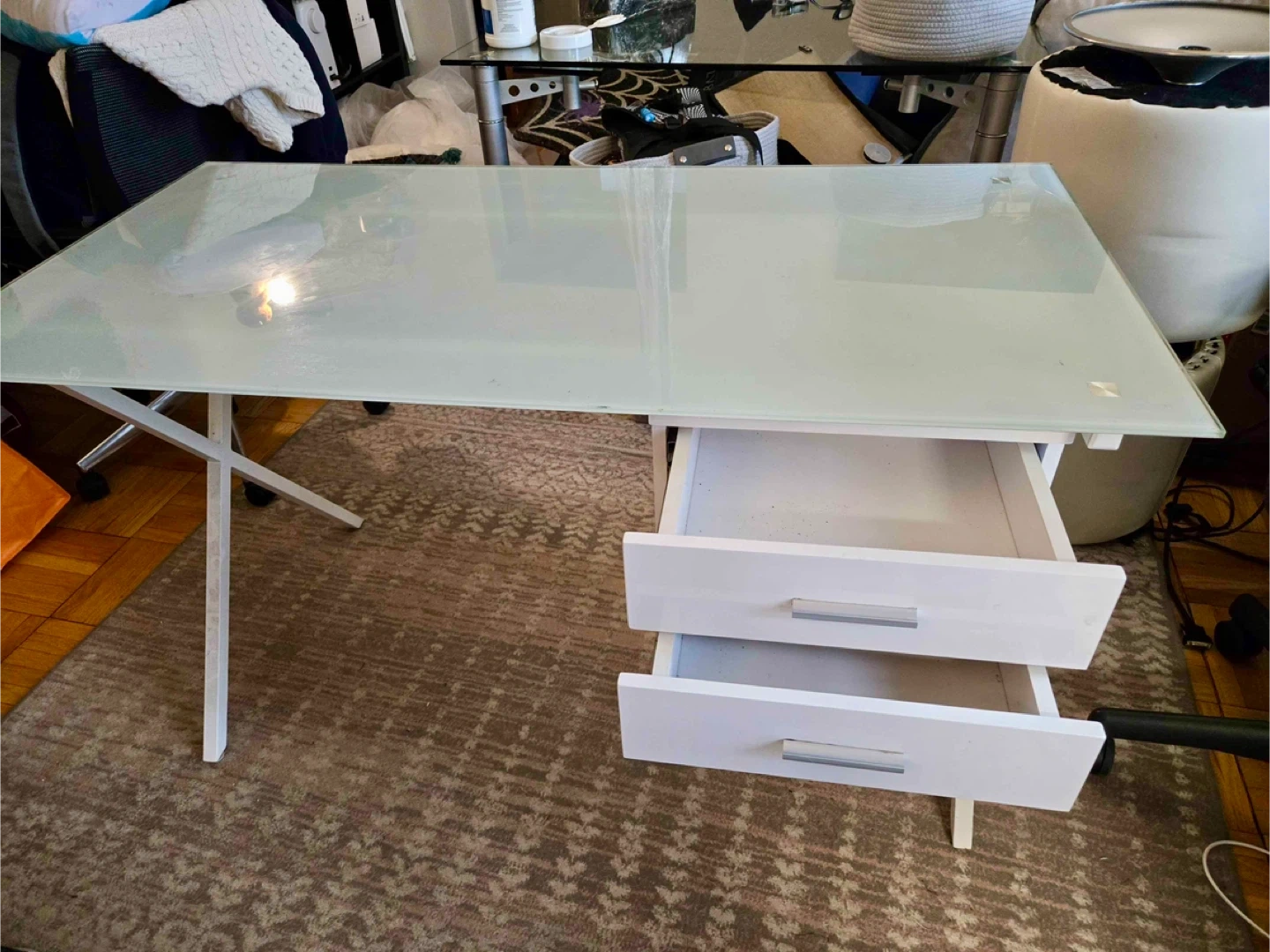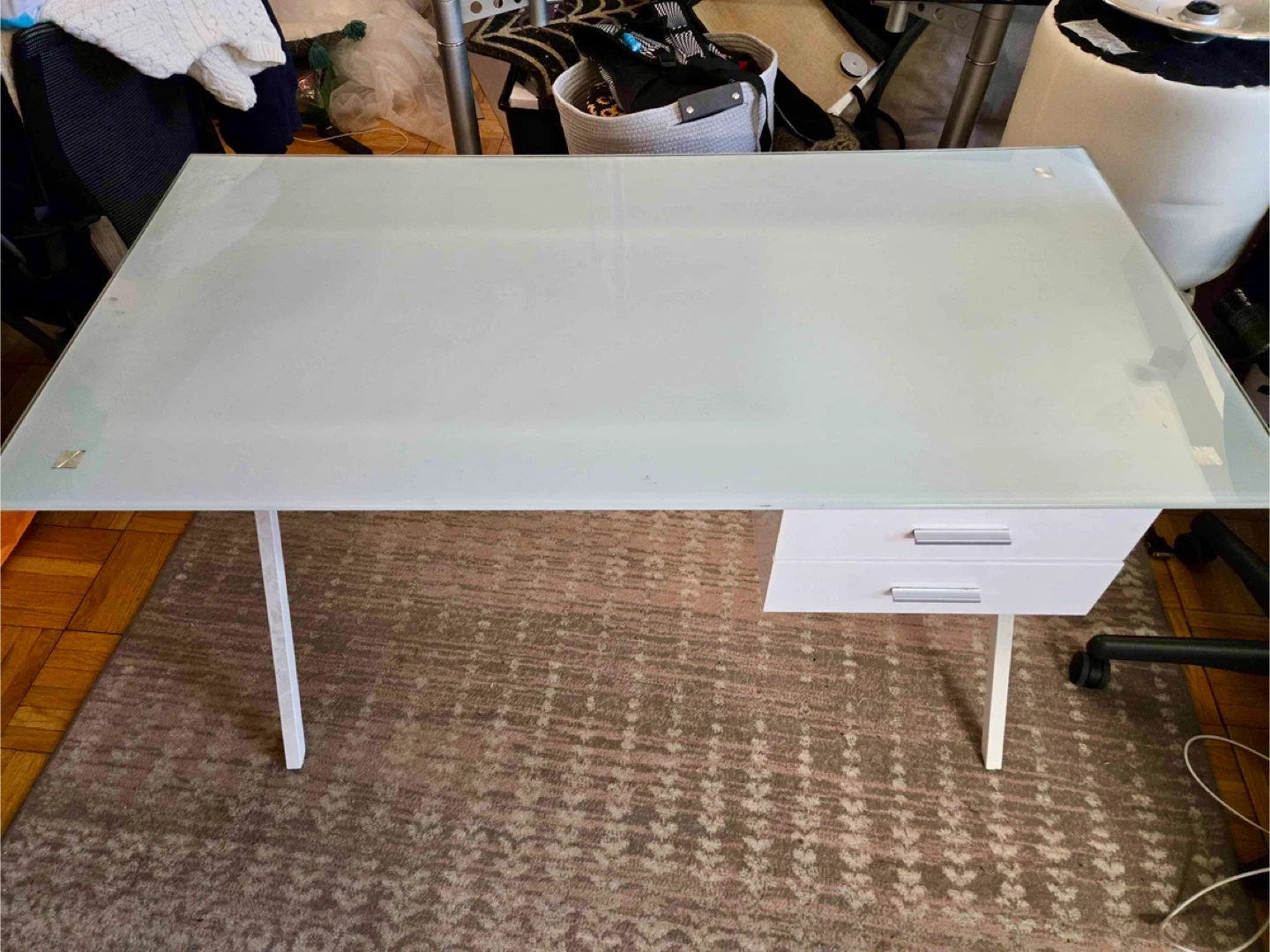 Frosted glass desk on a metal base with two wood laminate drawers. The glass top can be removed for easier transportation.