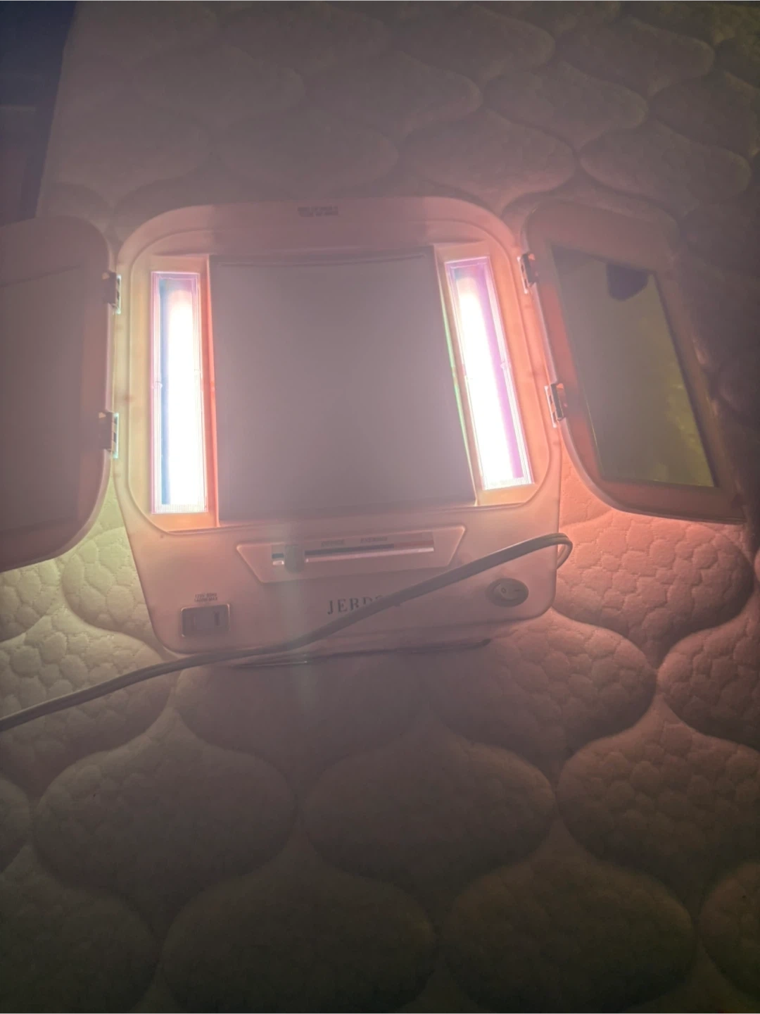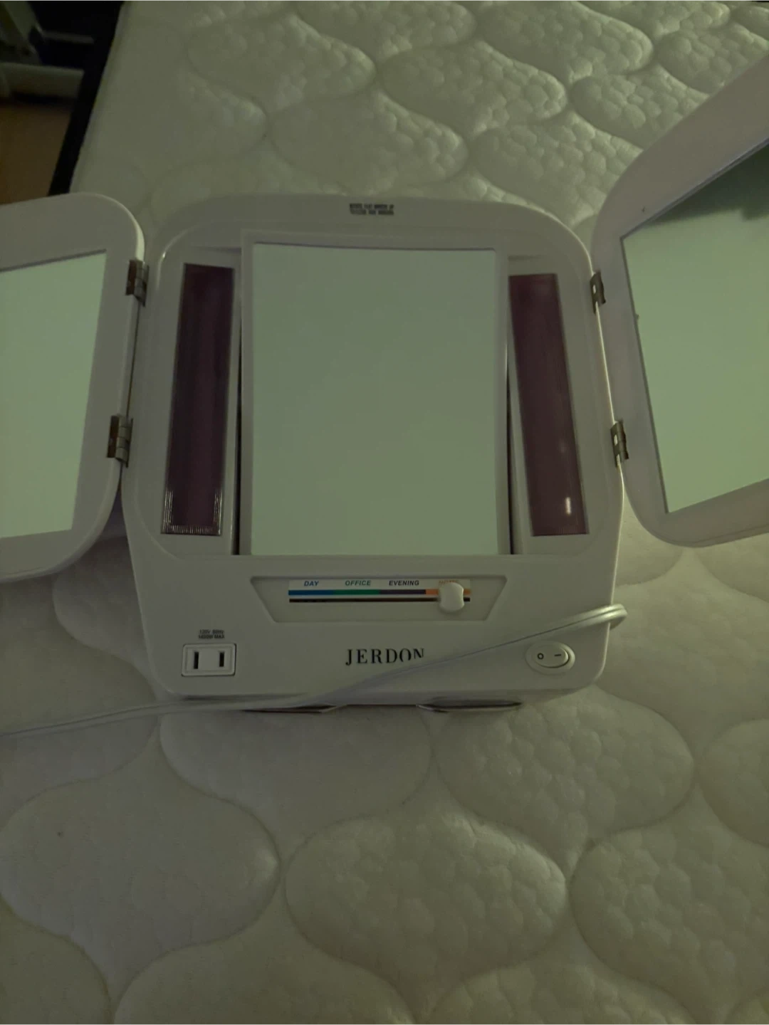 This Jerdon tri-fold vanity mirror features built-in lights for makeup application. It has adjustable light settings for 'Day', 'Office', and 'Evening' use. The mirror offers a clear reflection with side panels for a full view.