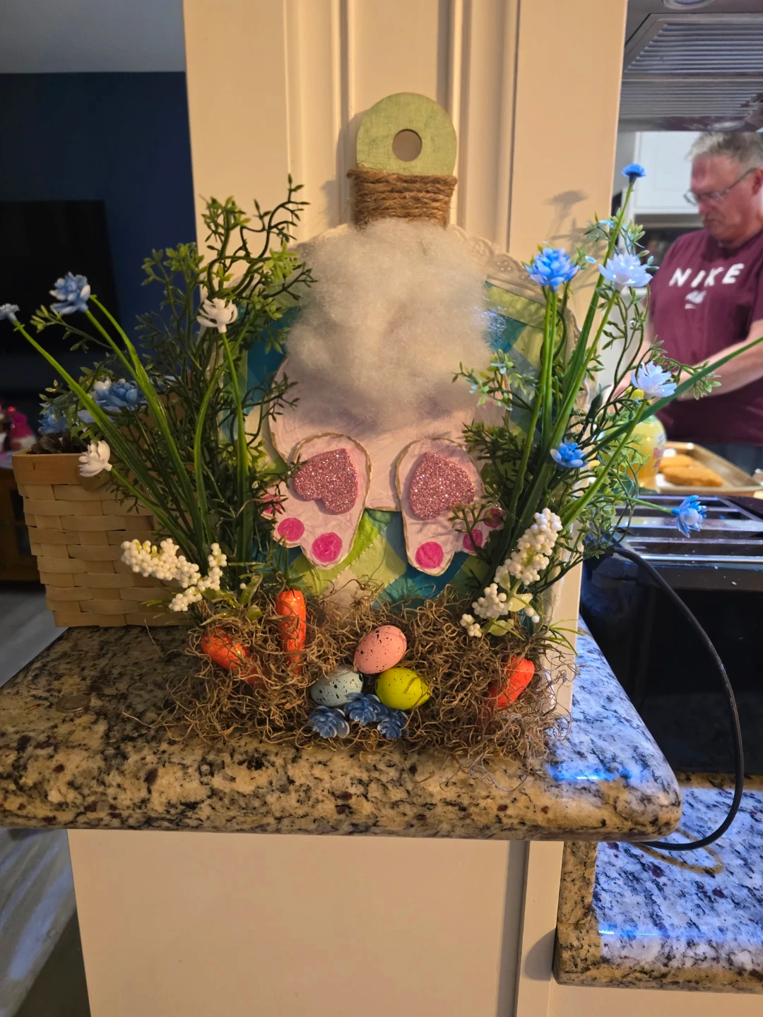 This is a festive Easter decoration featuring a bunny with glittery feet. It's adorned with faux grass, mini carrots, and decorative eggs. It's perfect for adding a touch of spring to your home!
