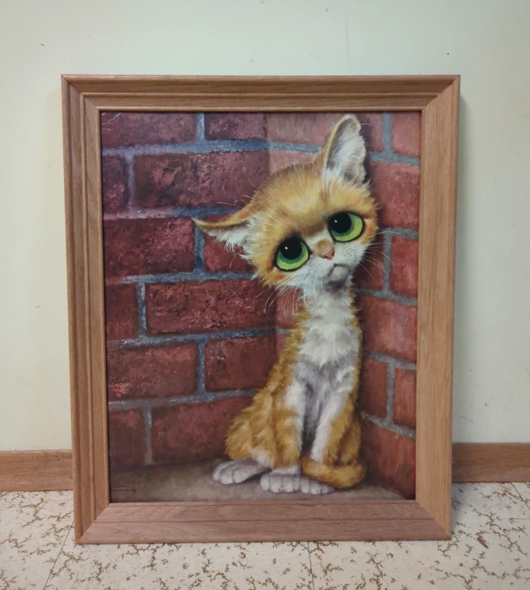 This framed painting features a cute, big-eyed orange tabby cat looking sad while sitting in a brick corner. The artwork is presented in a simple wooden frame. It's a charming piece for any cat lover's home!