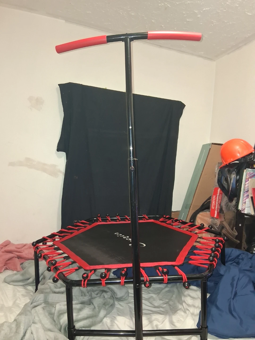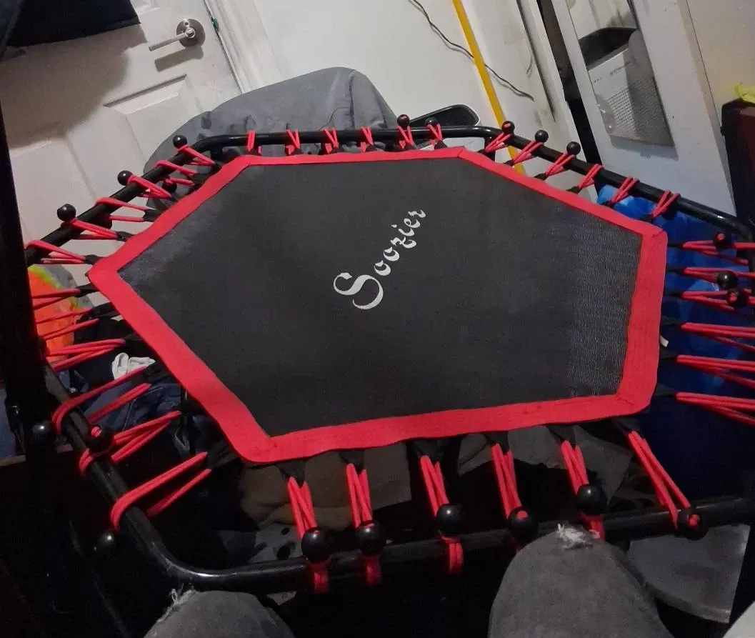 This is a Soozier fitness trampoline. It has a hexagonal jumping mat with a red trim and bungee cord suspension. The frame is black.