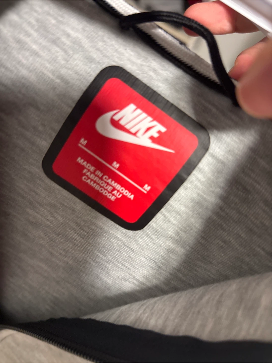 This is a grey Nike Tech Fleece hoodie. It's a size medium and made in Cambodia. The hoodie has a full zip closure and a zippered pocket on the sleeve.