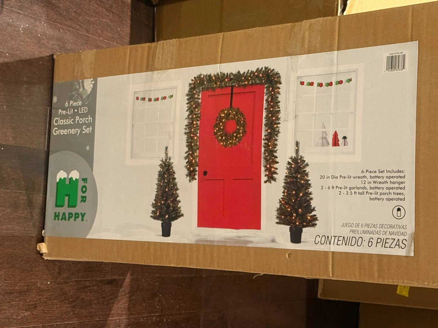 This 6-piece set includes a 20-inch diameter pre-lit wreath and 2-6 foot pre-lit garlands. It also comes with 2-3.5 foot tall pre-lit porch trees. All pieces are battery operated.