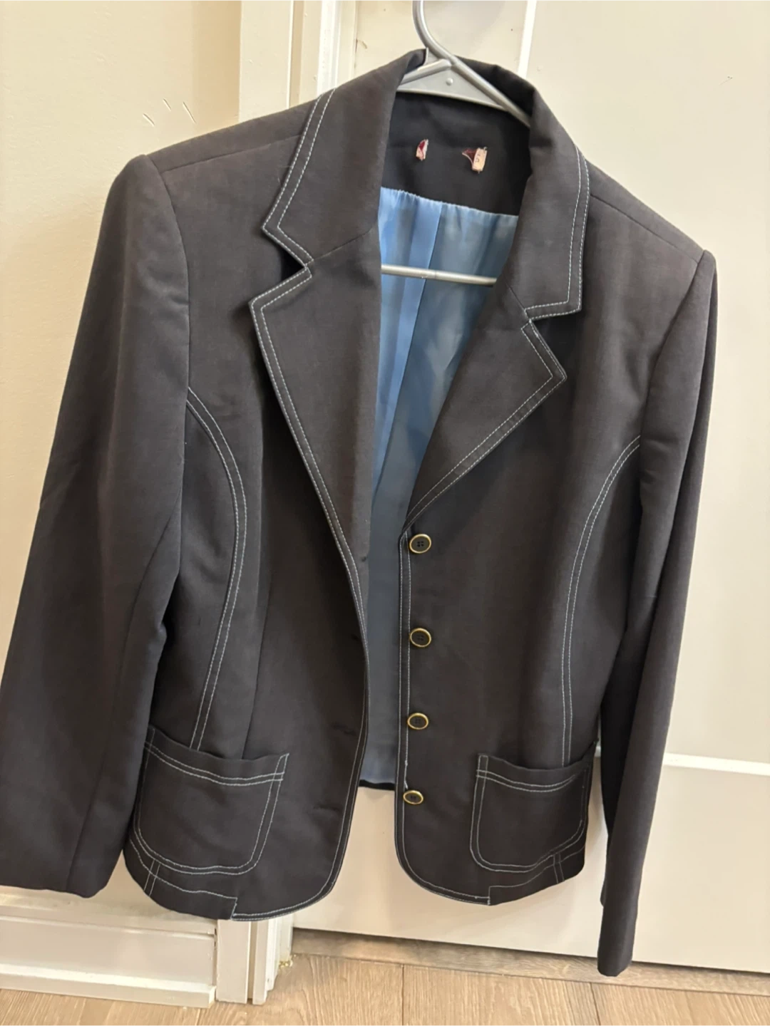 This dark grey blazer features contrasting white stitching detail. It has a light blue lining and three front buttons. The material appears to be a polyester blend.