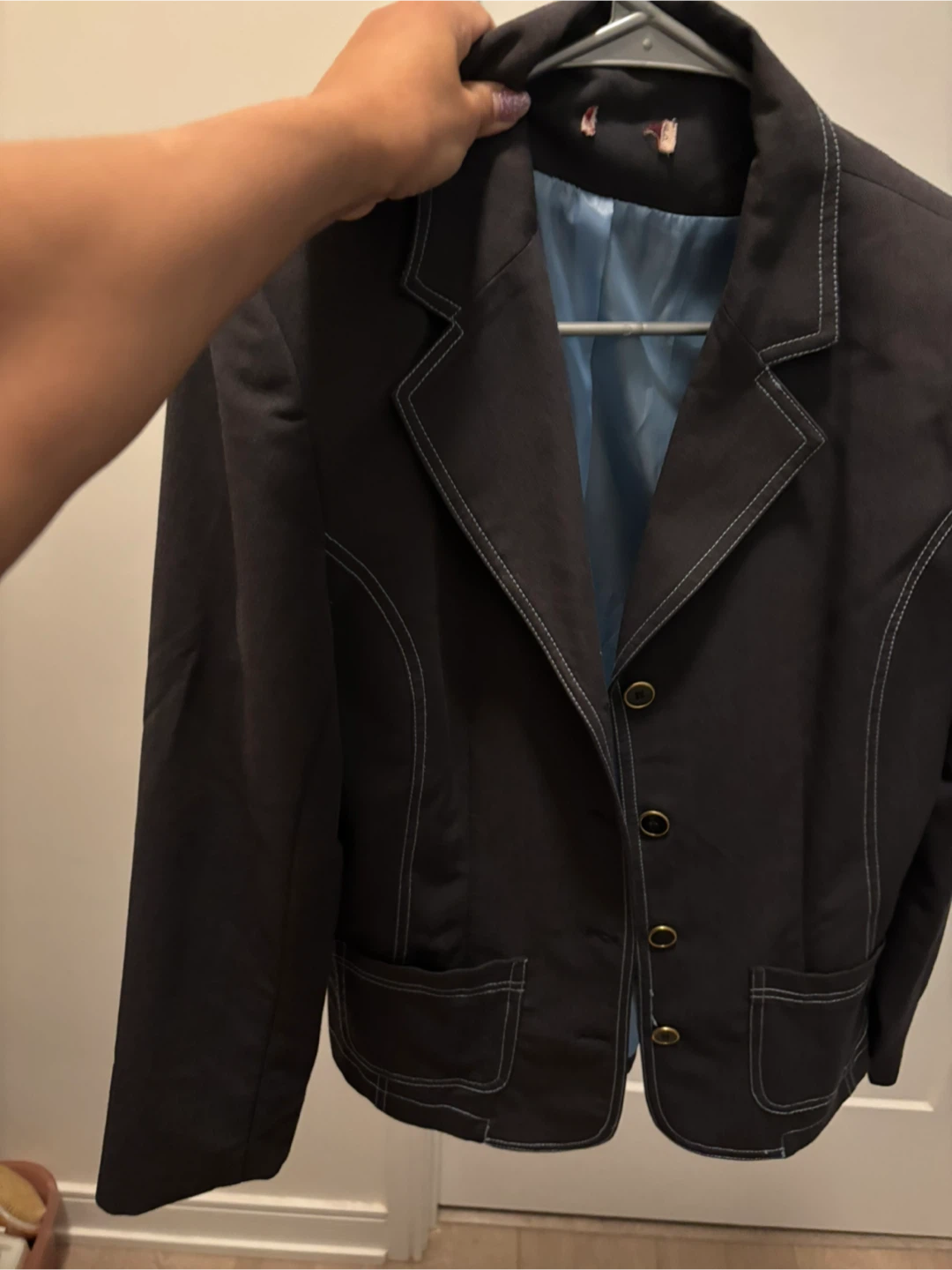 This dark grey blazer features contrasting white stitching detail. It has a light blue lining and three front buttons. The material appears to be a polyester blend.