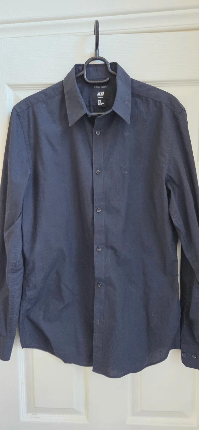 This is an H&M men's slim fit button-up shirt. It's designed for easy ironing. The shirt is a dark navy blue colour and a size small