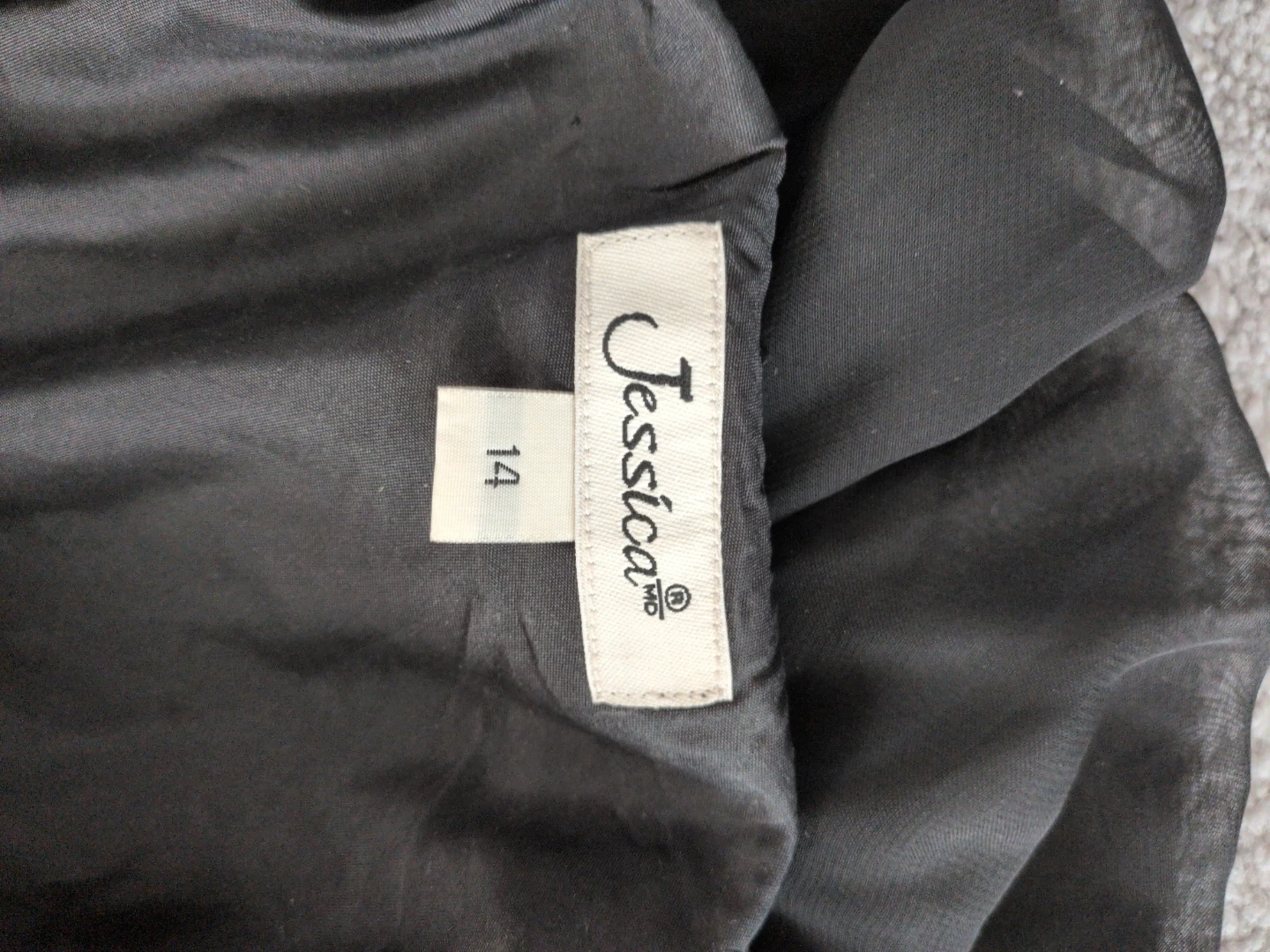 Jessica black chiffon dress with beaded detailing on the bodice and sleeves. It features a tiered skirt and flutter sleeves. Size 14.