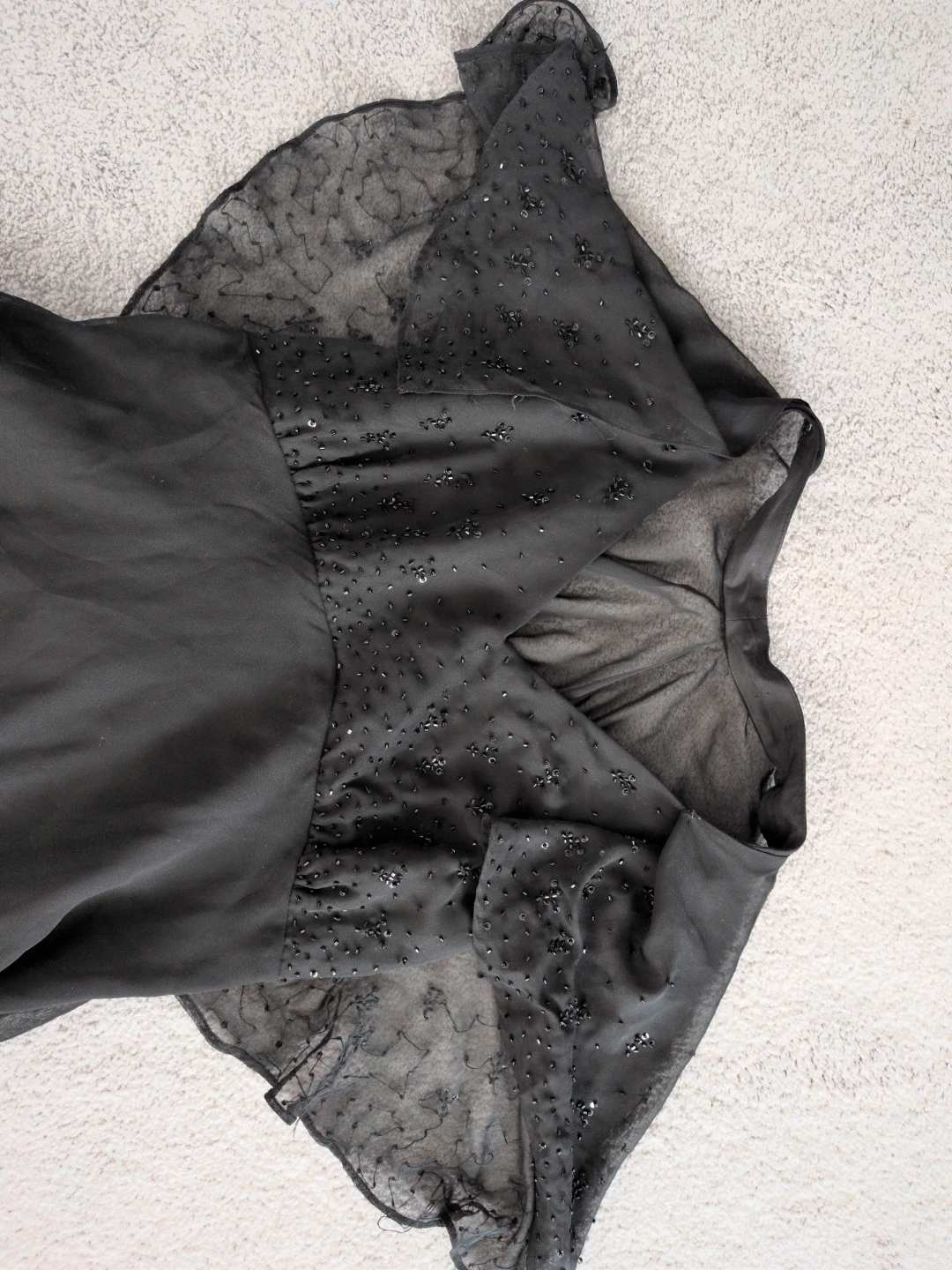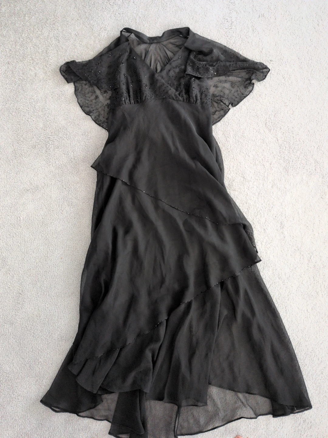 Jessica black chiffon dress with beaded detailing on the bodice and sleeves. It features a tiered skirt and flutter sleeves. Size 14.