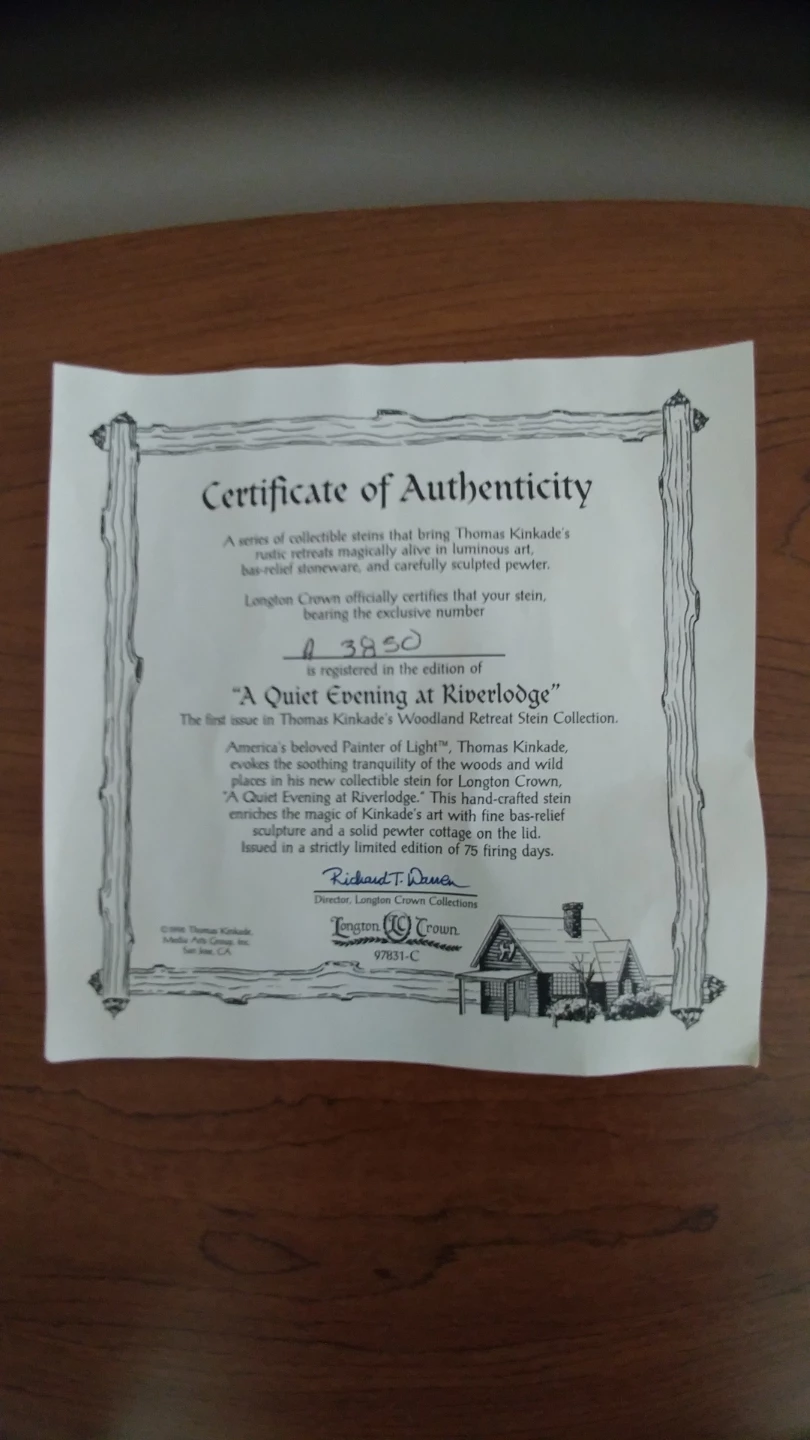 Selling a Thomas Kinkade collectible stein titled "A Quiet Evening at Riverlodge". This stein is part of the Thomas Kinkade Woodland Retreat Stein Collection. It evokes the soothing tranquility of the woods and wild creatures. It's a handcrafted stein that enriches the magic of Kinkade's art with fine bas-relief sculpture and a solid pewter sculpture on the lid