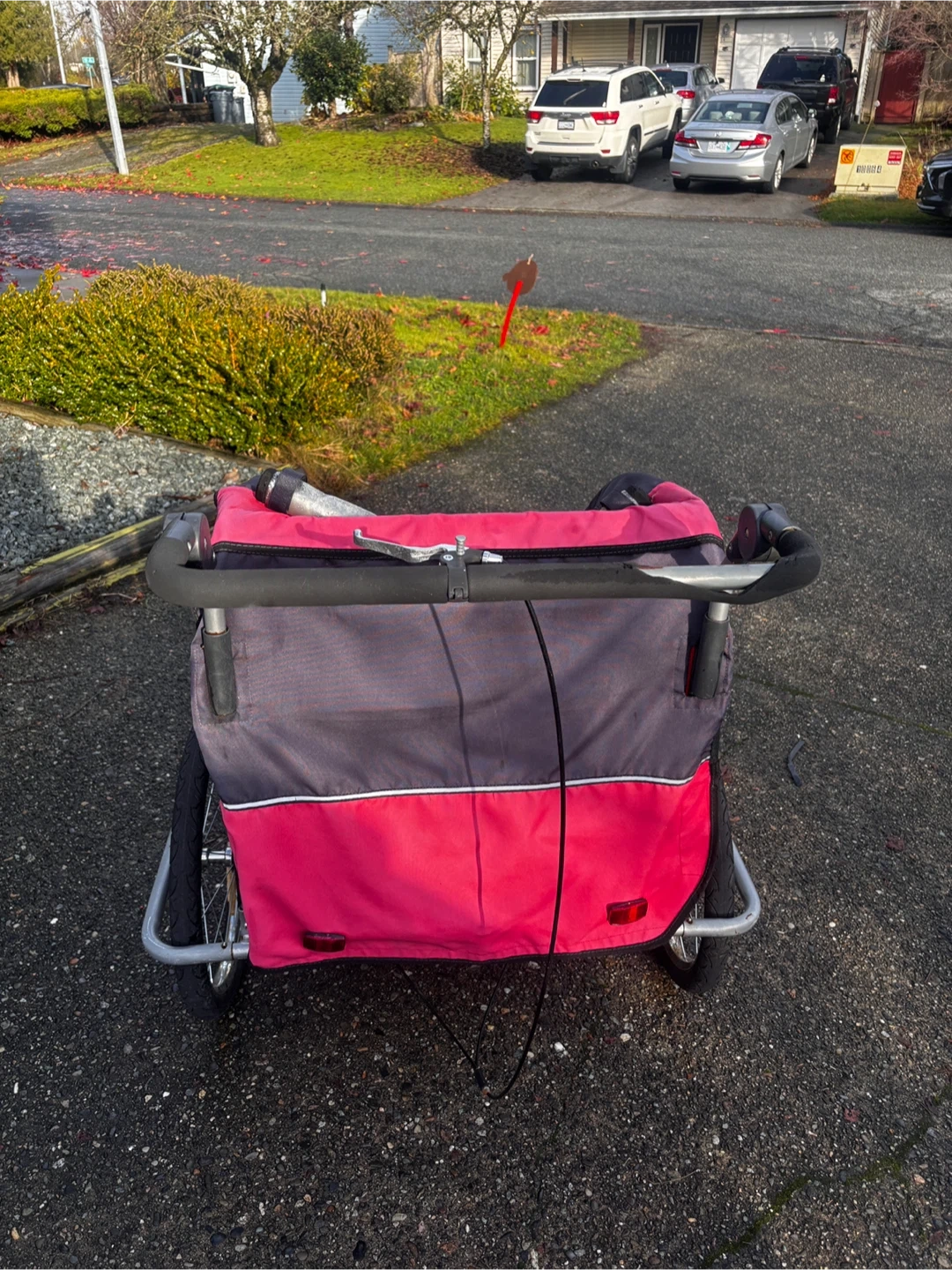 Amazing bike trailer that also works as a stroller and jogging stroller. Comfortable seat, safety harnesses, and back storage compartment. Complete with 2 layer wind screen/rain cover. Sells online for $230-$260. Asking $100.