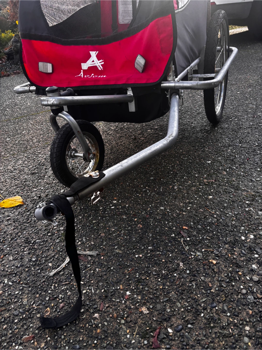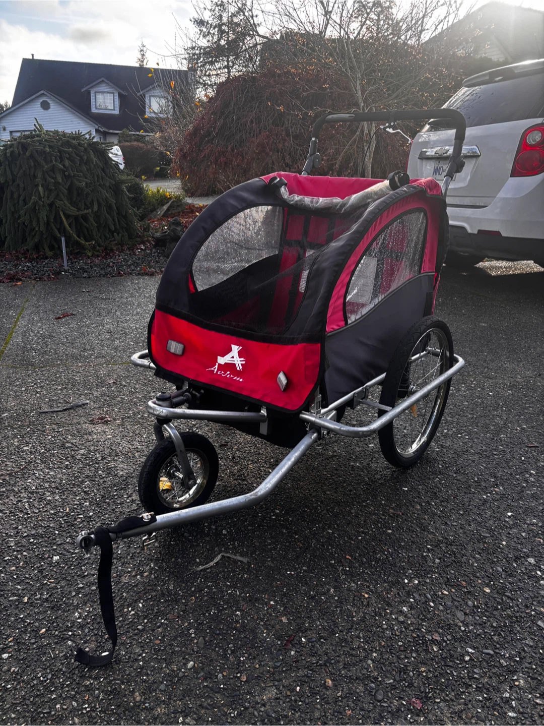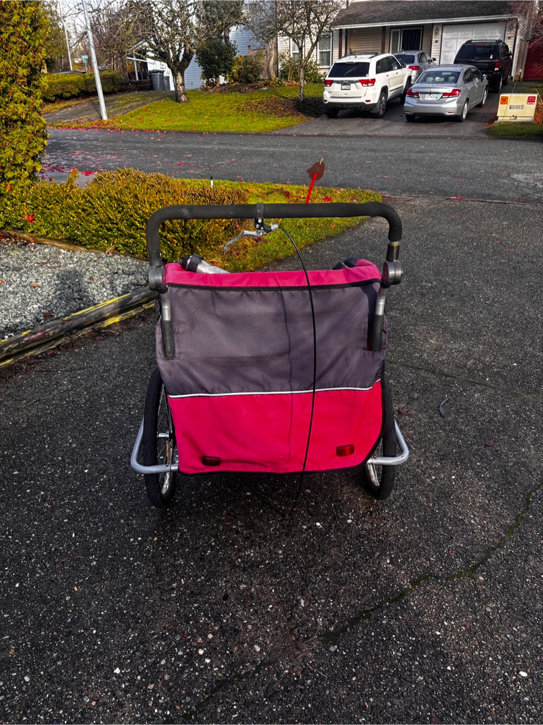 Amazing bike trailer that also works as a stroller and jogging stroller. Comfortable seat, safety harnesses, and back storage compartment. Complete with 2 layer wind screen/rain cover. Sells online for $230-$260. Asking $100.