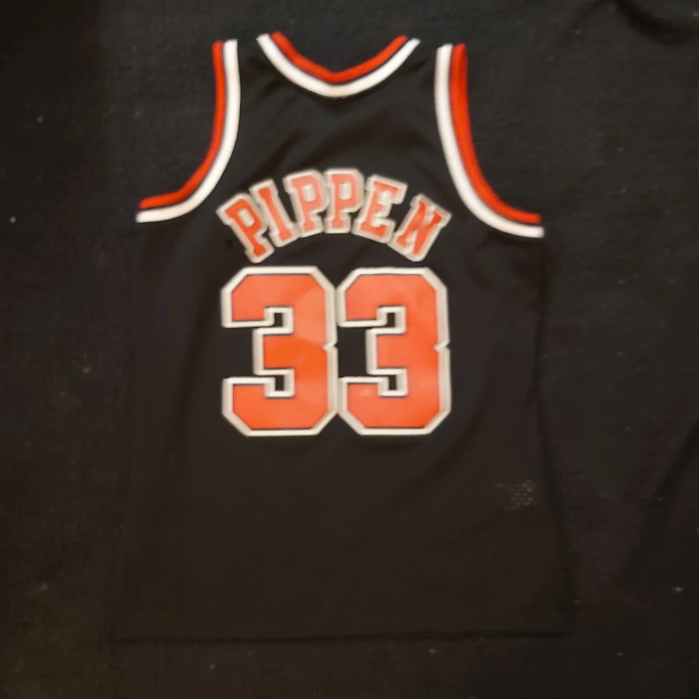 This is a Mitchell & Ness replica jersey for Scottie Pippen of the Chicago Bulls, number 33. It's black with red and white trim. A great piece for any basketball fan!