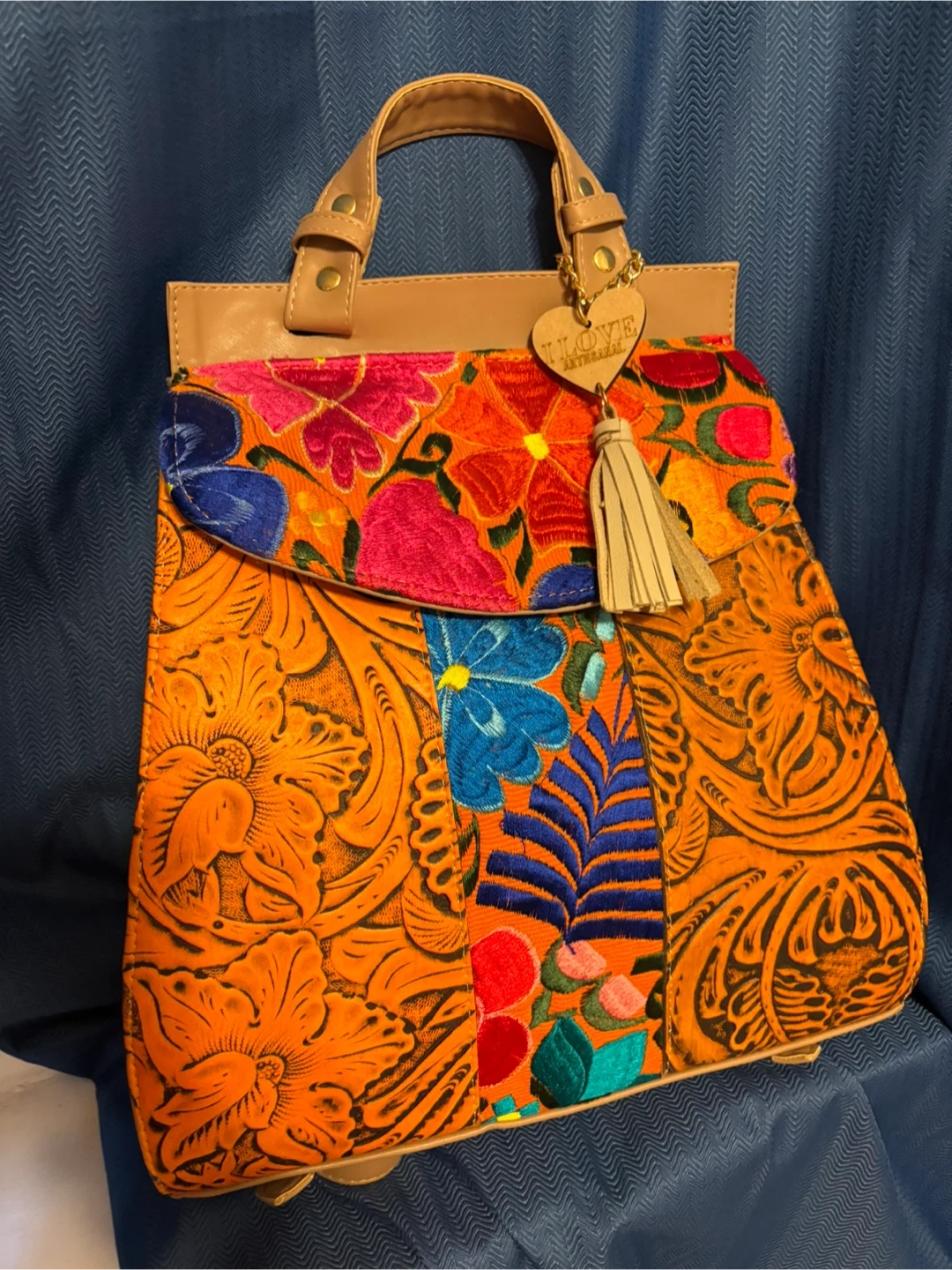 This unique backpack features a beautiful floral design on tooled leather. It has adjustable straps and a top handle, perfect for everyday use. The vibrant colours and detailed craftsmanship make it a standout piece!