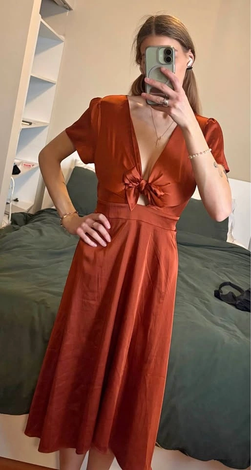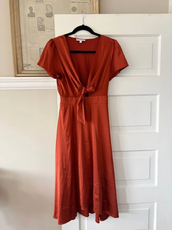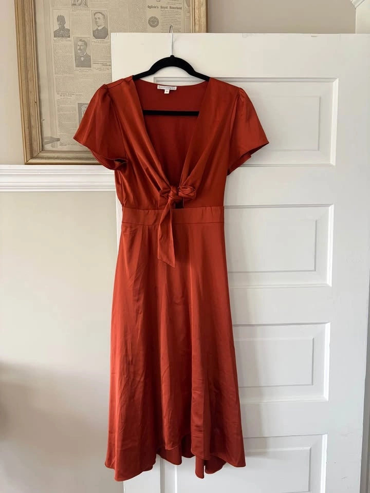 Super beautiful burnt orange dress. Worn once for a wedding! Tie in the front with cut out below tie. The dress is from “Baltic Born” and is a size small, but could fit an XS to Medium! Pick up preferred, but drop off available in the Victoria area.