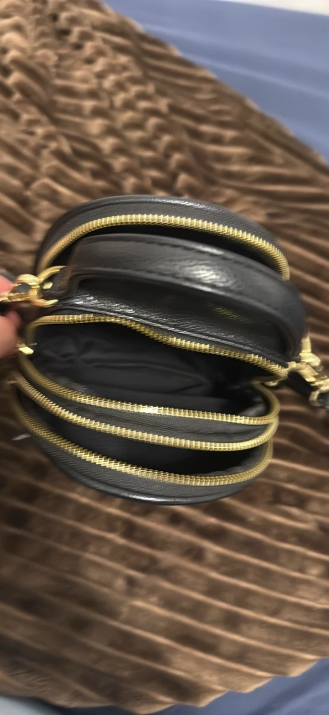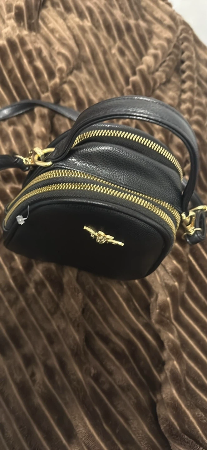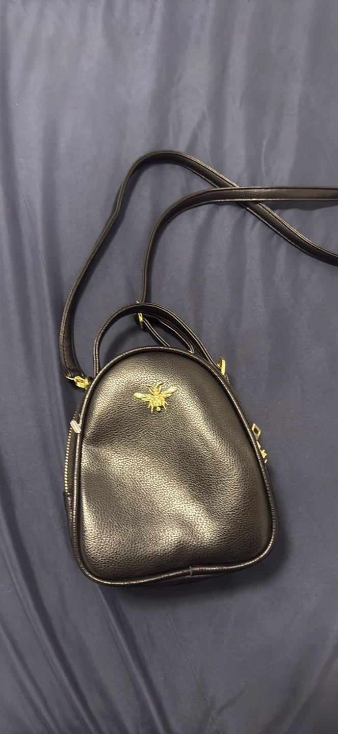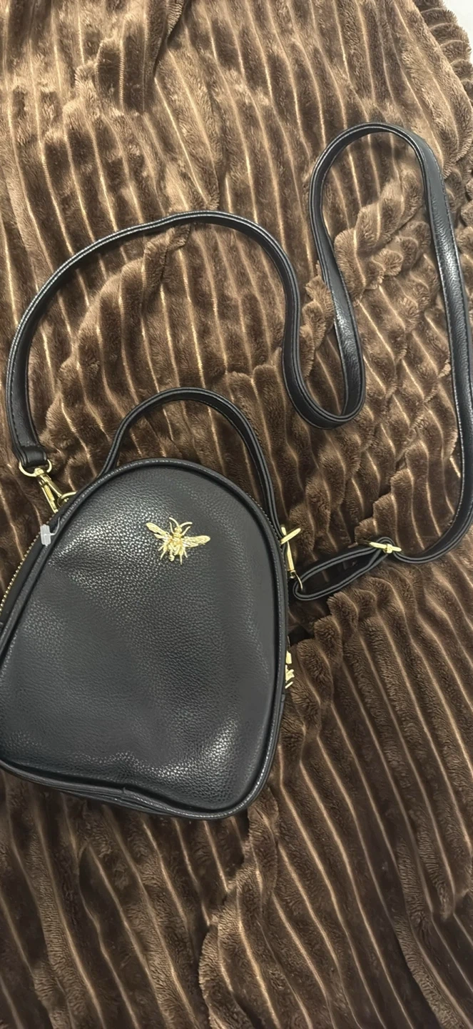 This black mini handbag features a gold bee emblem and gold zippers. It has a crossbody strap for easy carrying. The bag offers a compact storage solution for essentials.