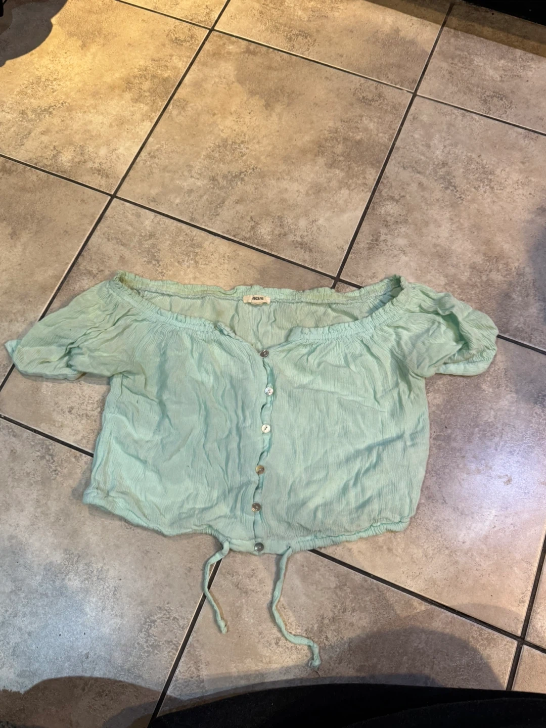 This Ardene off-shoulder crop top is a lovely mint green colour. It features a button-up front and a drawstring tie at the hem. The crinkled fabric adds a nice texture. Great for a casual summer look!