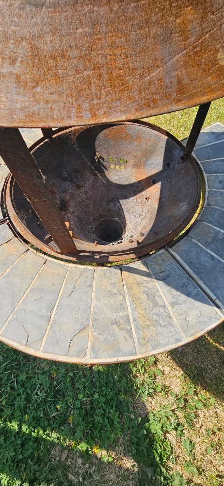 Fire pit with tile top. Includes a decorative metal shade. Sits on an ornamental metal base. Would be perfect for those late-night chats under the stars.