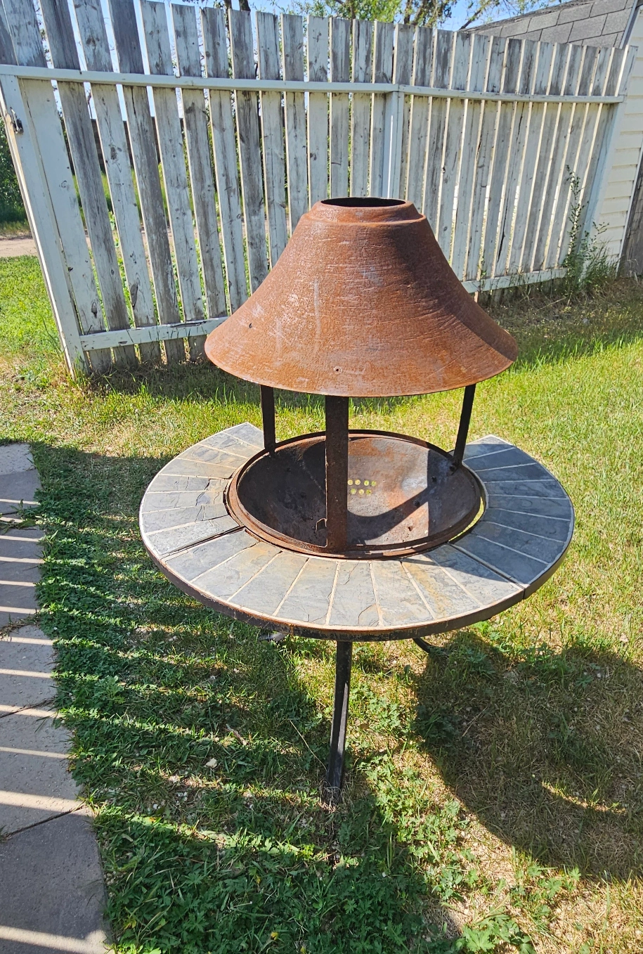 Fire pit with tile top. Includes a decorative metal shade. Sits on an ornamental metal base. Would be perfect for those late-night chats under the stars.