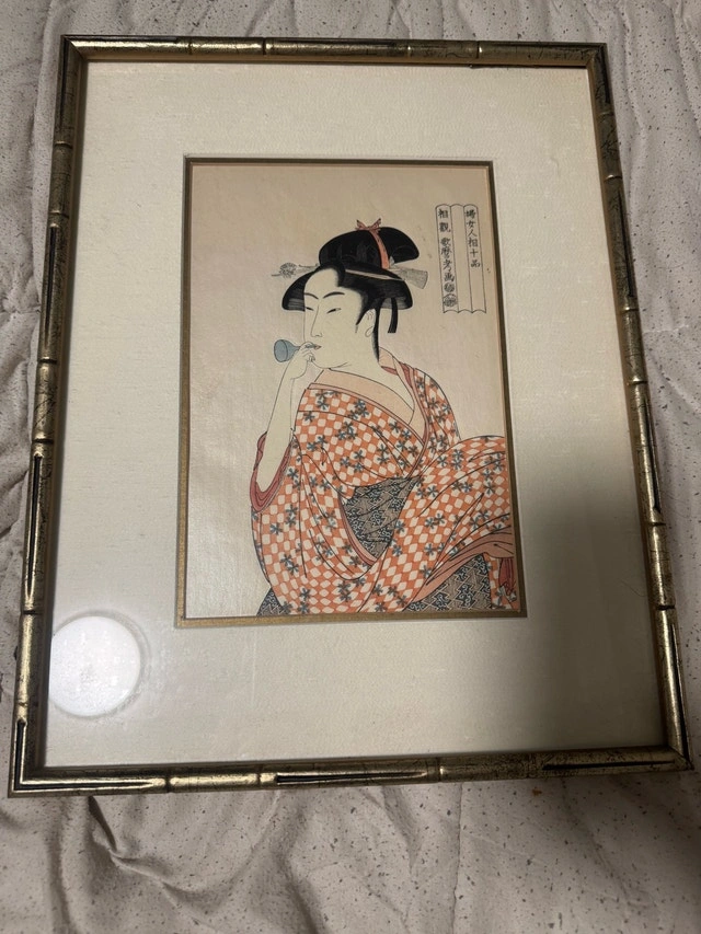 This captivating framed Japanese artwork features an elegant geisha in a traditional setting. The piece is a print and the frame is a faux bamboo. This item is in good condition, ready to add a touch of cultural elegance to any space. If the ad is up, it's still available. A framed piece like this is sure to inspire conversation and admiration among friends and family.