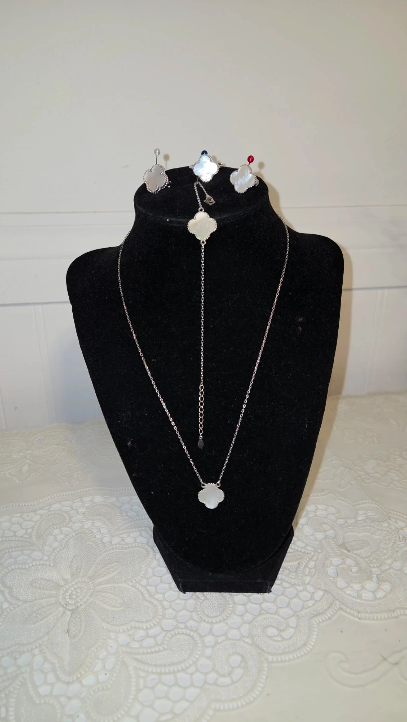 This set includes a statement necklace and matching dangle earrings. The intricate filigree design adds elegance to the pieces. They're crafted from a silver-tone metal and perfect for adding a decorative touch to an outfit.