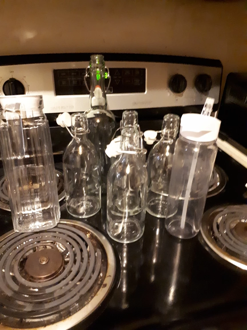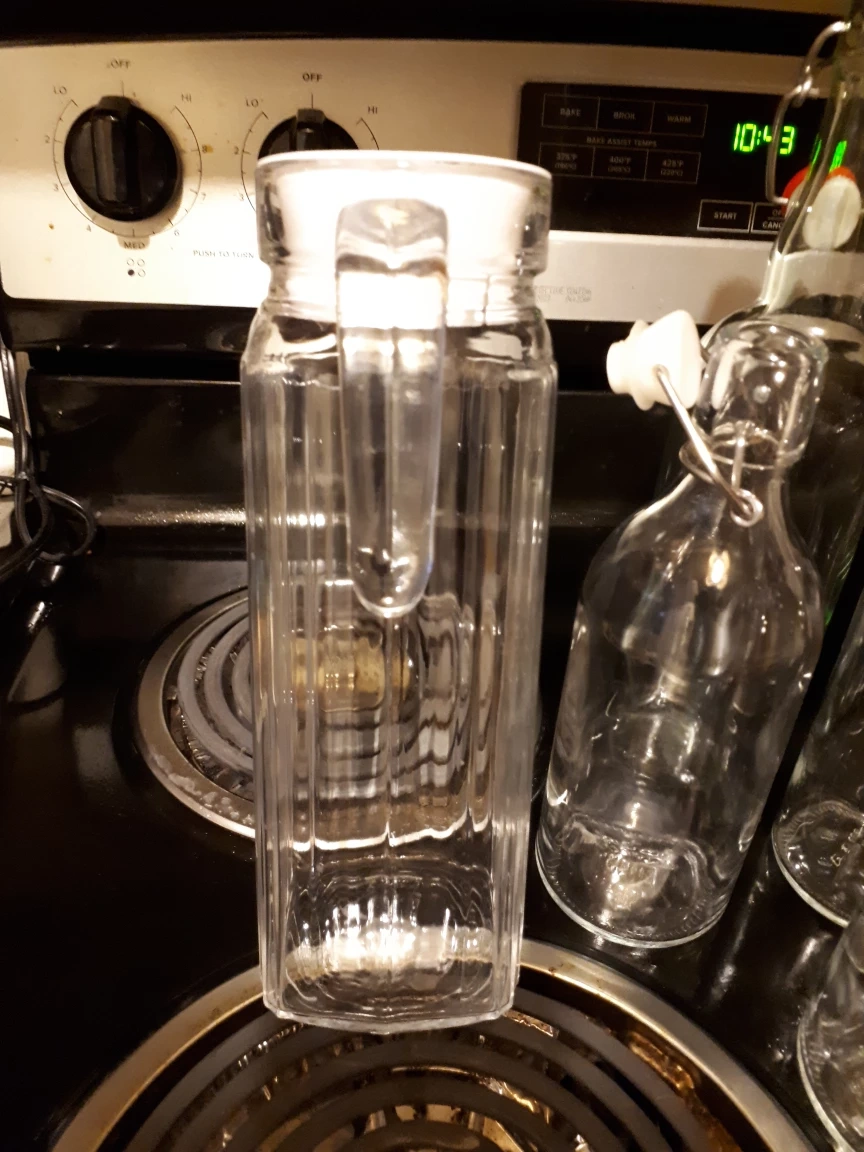 Selling a set of assorted 5 glass bottles, water bottle and a pitcher. They're all in great shape and ready for a new home. Perfect for storing drinks or adding a touch of vintage charm to your kitchen! They are clear glass.