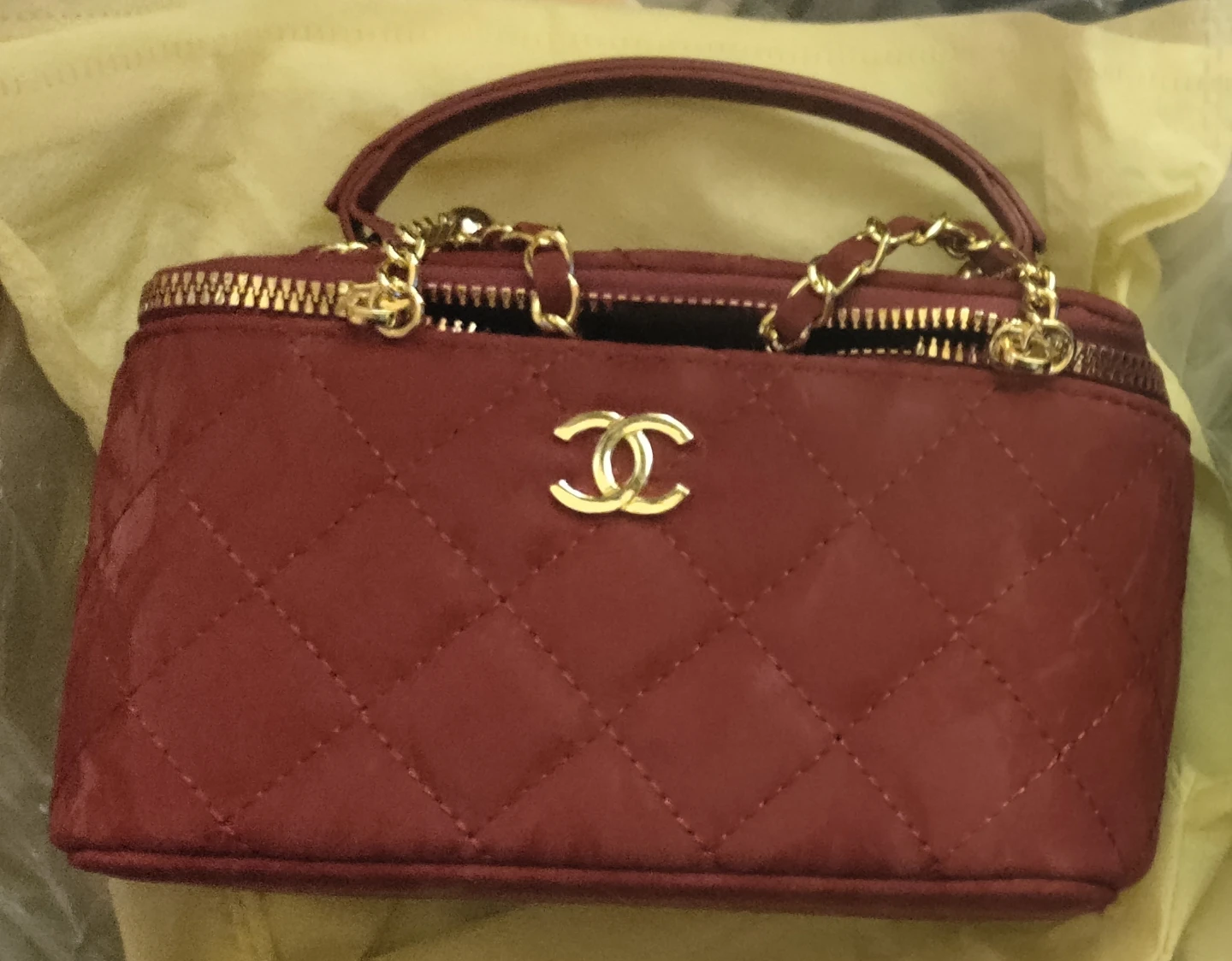 This is a quilted red Chanel vanity case/ crossbody. It features gold hardware and a top handle. Its compact size makes it convenient for travel or everyday use.
