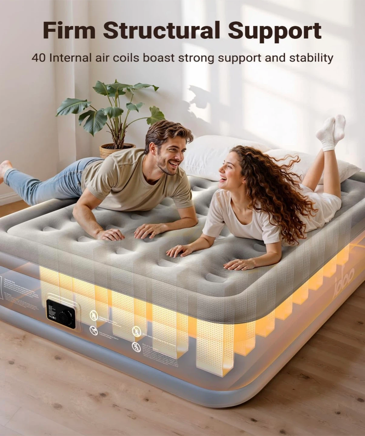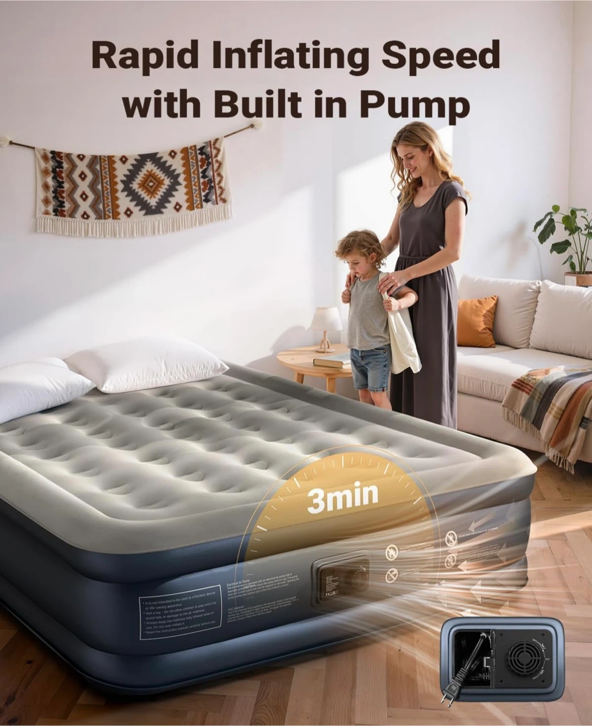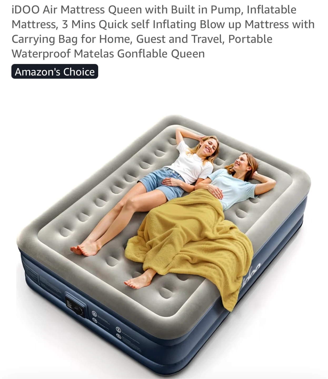 Selling a new queen size iDOO air mattress! It has a built-in pump for easy inflation. This inflatable mattress self inflates in just 3 minutes. It's waterproof and comes with a carrying bag, making it perfect for home, guests, or travel