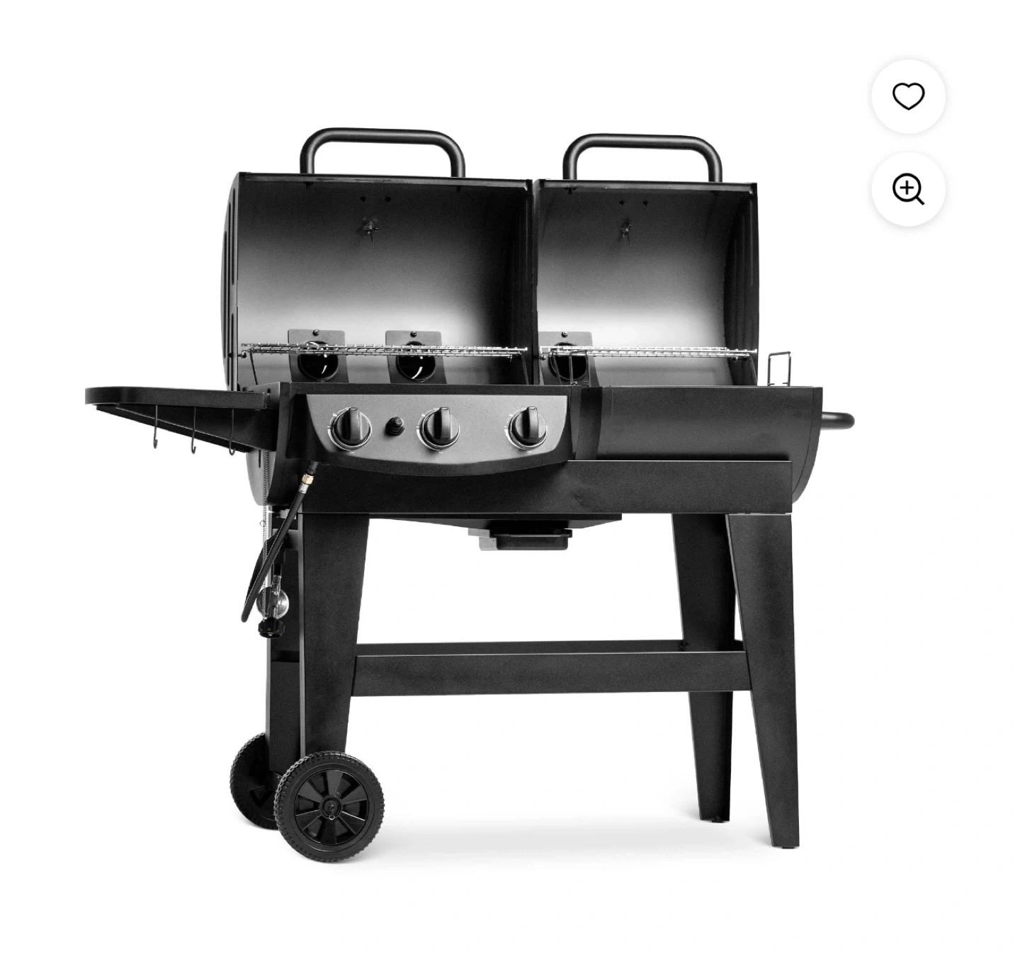 This Char-Griller Duo grill offers both gas and charcoal cooking options. It features multiple burners for gas grilling and a separate charcoal grate. The grill includes two side shelves for food prep and storage.