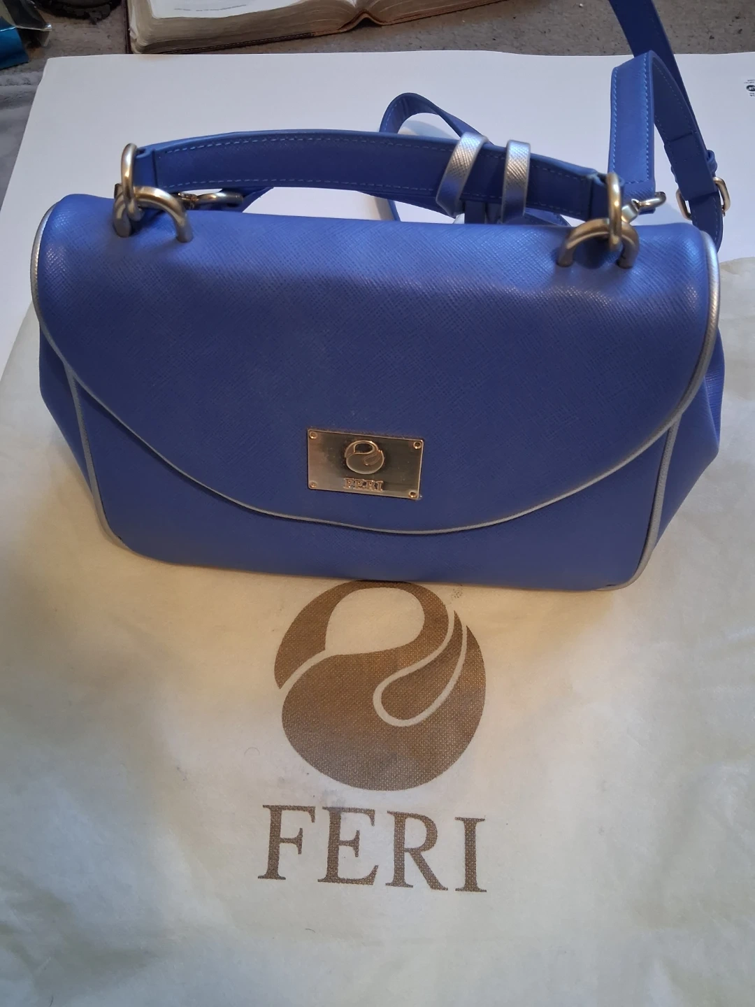 This Feri handbag is a stylish blue with a textured finish and gold-tone hardware. It includes a detachable crossbody strap for versatile wear. A decorative tassel adds a nice detail to the back zipper. The interior is lined and features a zippered pocket.