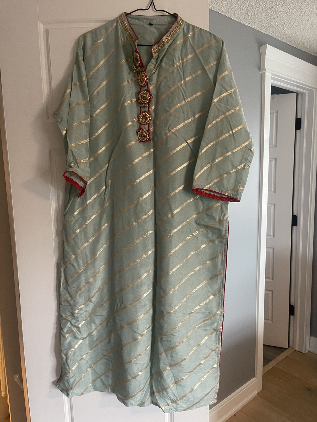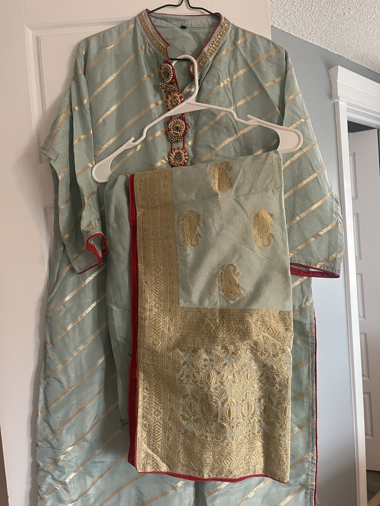 A beautiful light blue Salwar Kameez suit with a gold and green dupatta. The top features a button up closure, beaded embellishment, and gold diagonal stripes.