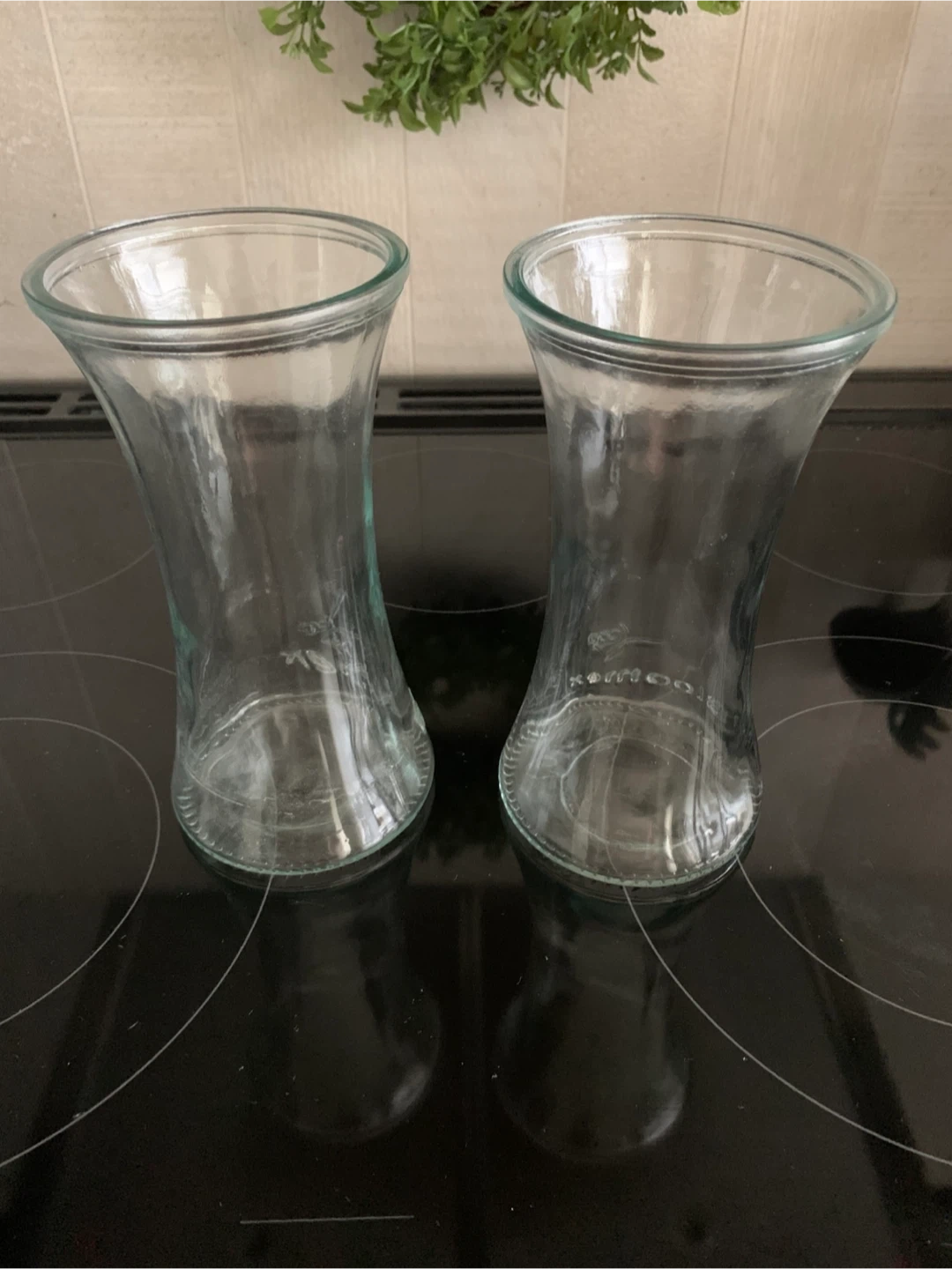 Two clear glass vases with a unique curved shape. Glass material. Perfect for displaying flowers or as decorative accents.