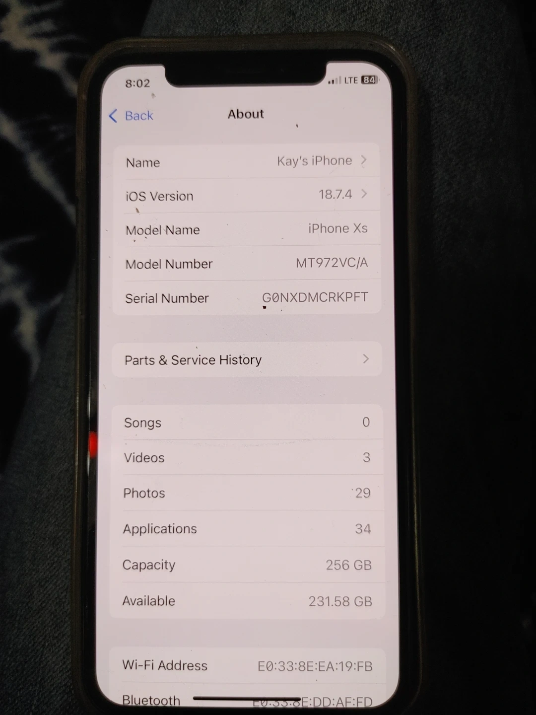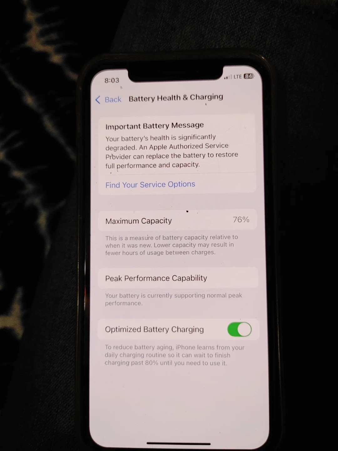 This is an Apple iPhone Xs with 256 GB of storage. The maximum battery capacity is currently 76% and it supports normal peak performance. It's great for everyday use and has plenty of space for apps and photos!