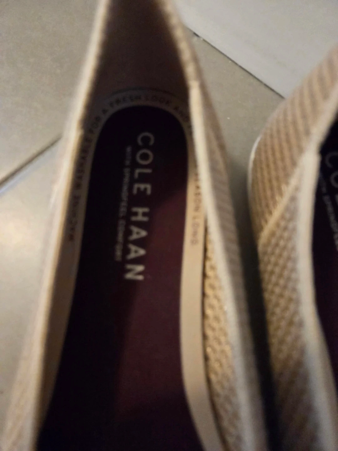Lightweight beige knit flat shoes from Cole Haan. Features a stylish woven texture and a comfortable insole. Made in Vietnam. Size 7.5B.