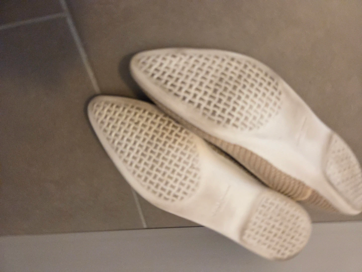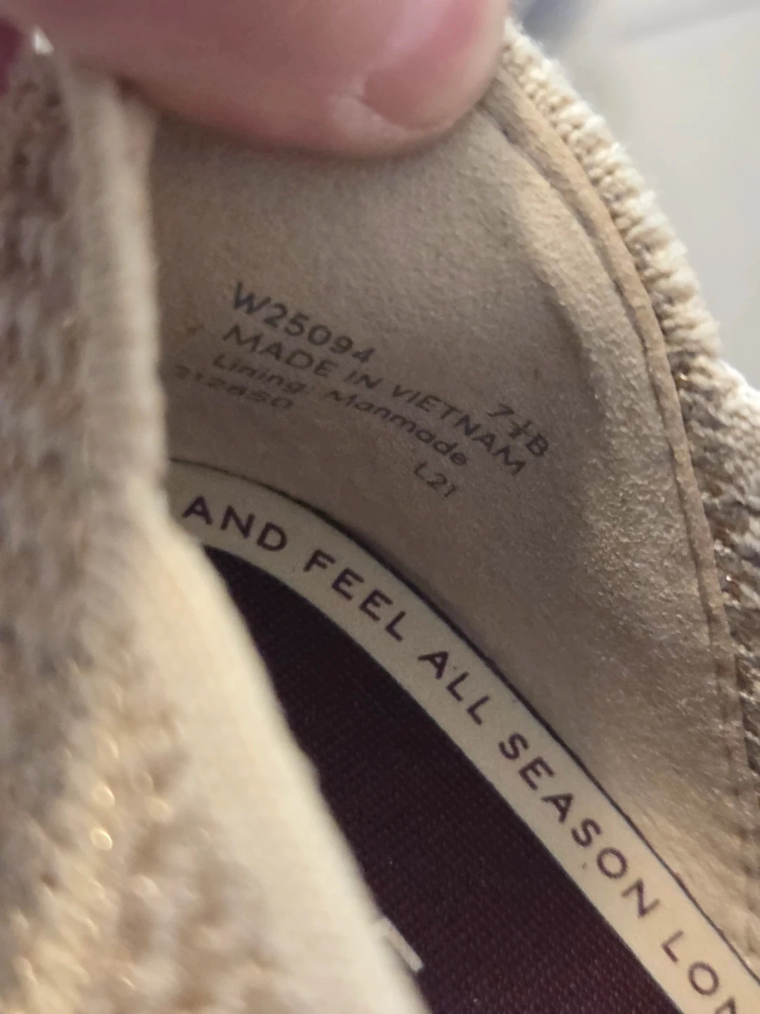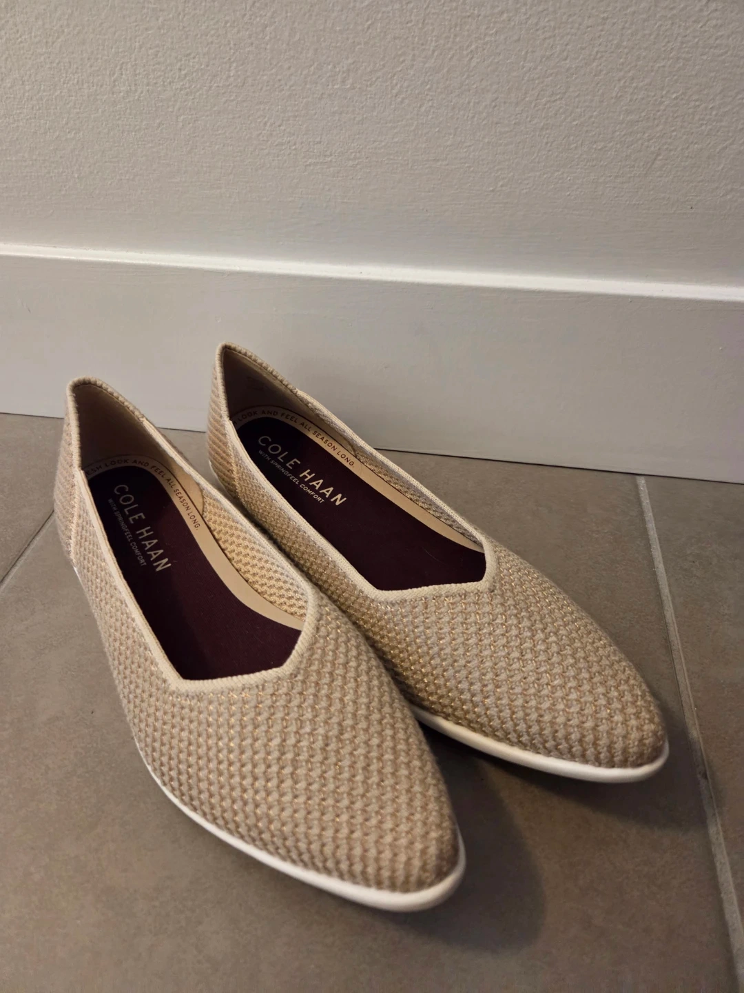 Lightweight beige knit flat shoes from Cole Haan. Features a stylish woven texture and a comfortable insole. Made in Vietnam. Size 7.5B.