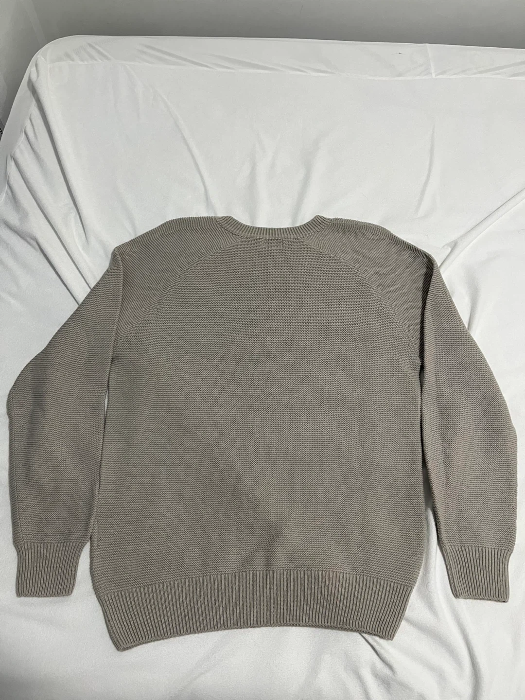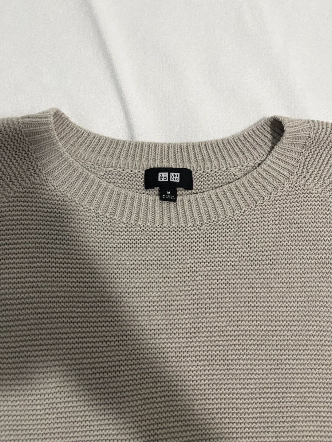 This is a UNIQLO crew neck sweater in a size medium. It's a light tan colour with a textured knit pattern. Ribbed cuffs and hem.