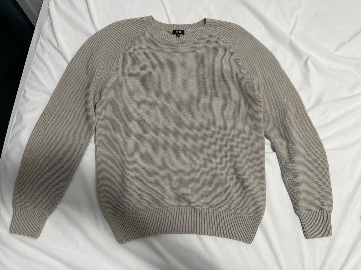 This is a UNIQLO crew neck sweater in a size medium. It's a light tan colour with a textured knit pattern. Ribbed cuffs and hem.