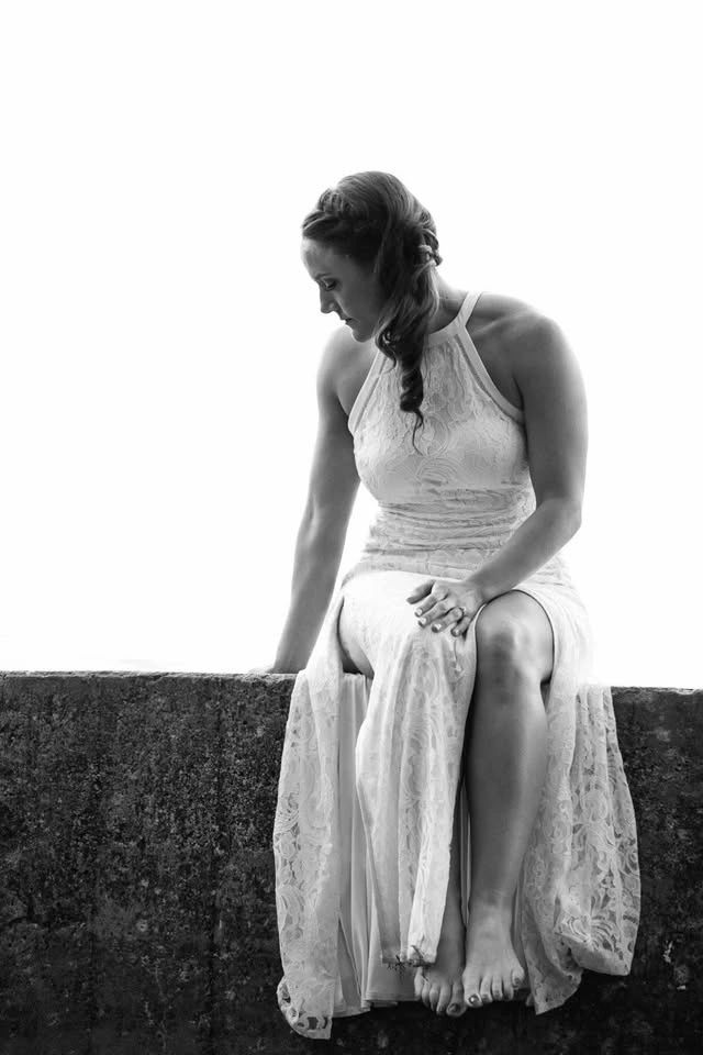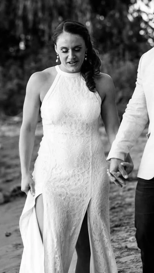 White lace halter-neck wedding dress by Guess, "Alina Lace Maxi" model. Features two splits up each side at the front. Size medium, with cups sewn in (easy to remove). Dry-cleaned since worn. Worn twice for an elopement and a photoshoot. Very flattering and elegant! $70 pick-up and try-on in Belleville. Originally purchased for $170 plus tax.