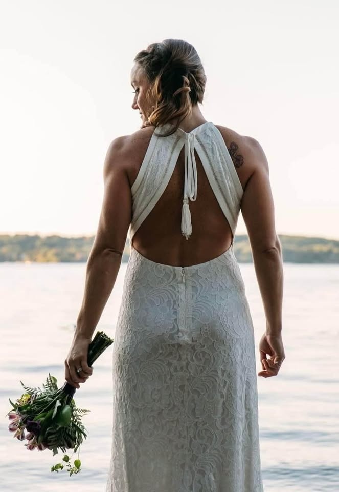 White lace halter-neck wedding dress by Guess, "Alina Lace Maxi" model. Features two splits up each side at the front. Size medium, with cups sewn in (easy to remove). Dry-cleaned since worn. Worn twice for an elopement and a photoshoot. Very flattering and elegant! $70 pick-up and try-on in Belleville. Originally purchased for $170 plus tax.